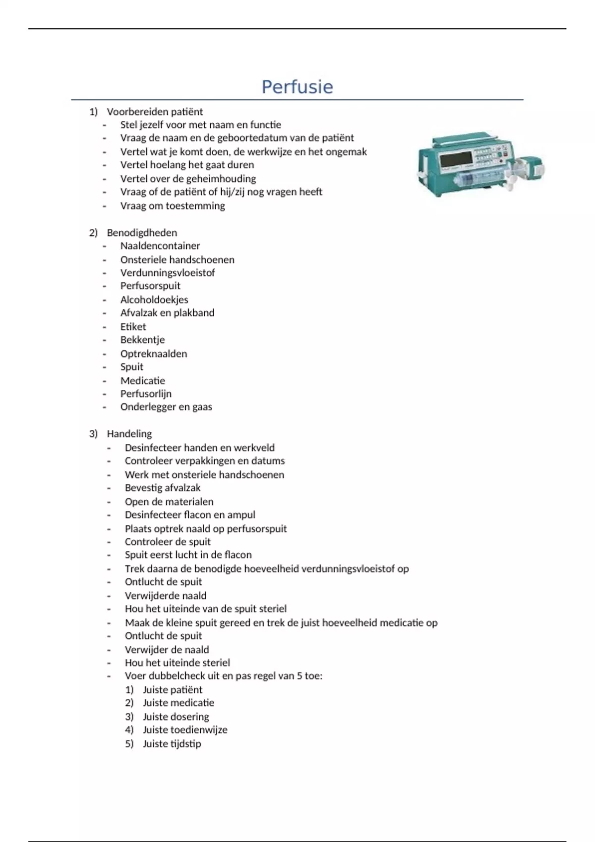 Dit document is goed te gebruiken bij het leren voor de performance assessment. Het bevat een beknopte uitleg over het installeren en aansluiten van een perfusie pomp.