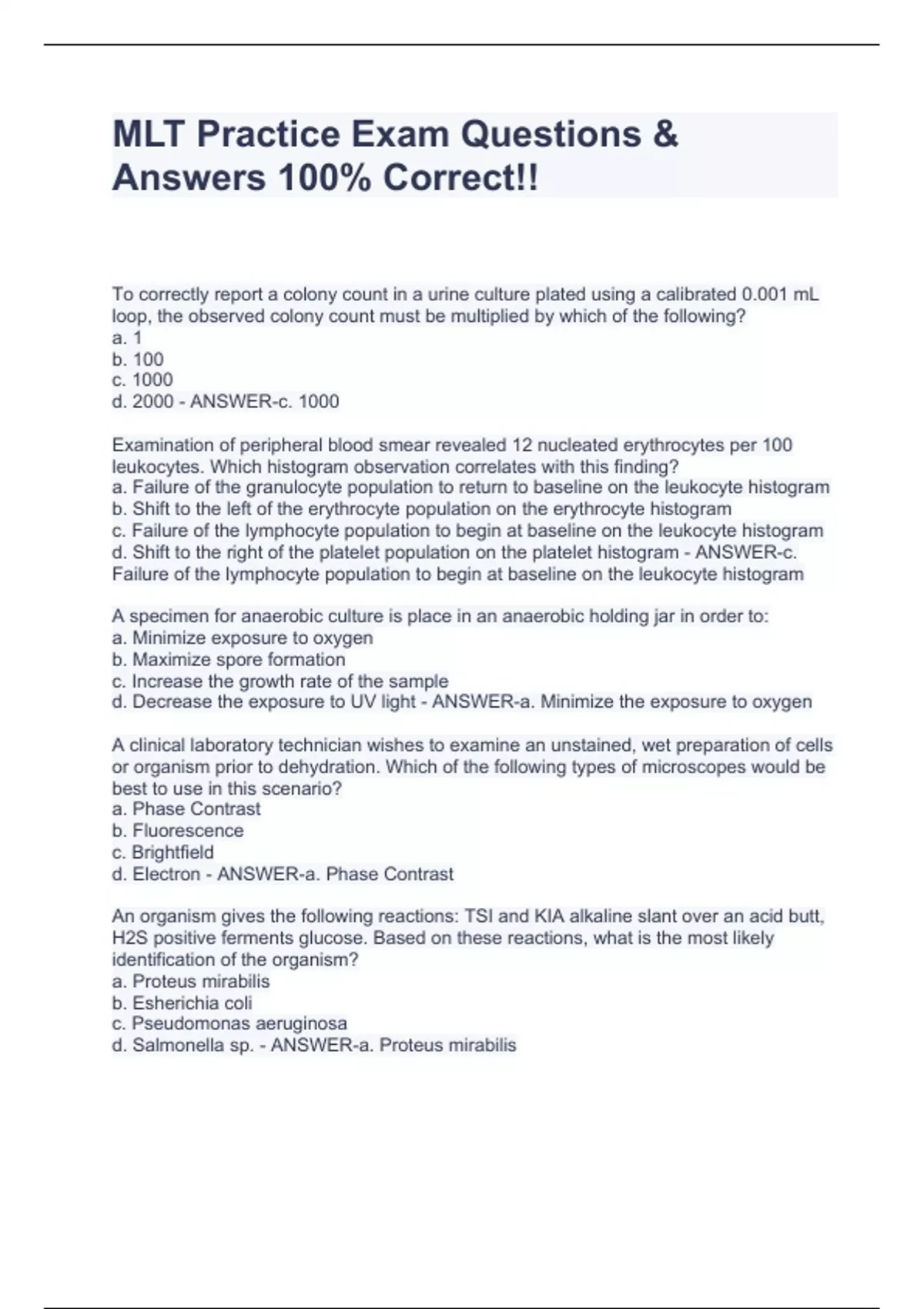 MLT Practice Exam Questions & Answers 100 To correctly report a colony count in a urine culture plated using a calibrated 0.001 mL loop, the observed colony count must be multiplied by which of the following? a. 1 b. 100 c. 1000 d. 2000 - ANSWER-c. 1000 Examination of peripheral blood smear revealed 12 nucleated erythrocytes per 100 leukocytes. Which histogram observation correlates with this finding? a. Failure of the granulocyte population to return to baseline on the leukocyte histogram b. Shift to the left of the erythrocyte population on the erythrocyte histogram c. Failure of the lymphocyte population to begin at baseline on the leukocyte histogram d. Shift to the right of the platelet population on the platelet histogram - ANSWER-c. Failure of the lymphocyte population to begin at baseline on the leukocyte histogram A specimen for anaerobic culture is place in an anaerobic holding jar in order to: a. Minimize exposure to oxygen b. Maximize spore formation c. Increase the growth rate of the sample d. Decrease the exposure to UV light - ANSWER-a. Minimize the exposure to oxygen A clinical laboratory technician wishes to examine an unstained, wet preparation of cells or organism prior to dehydration. Which of the following types of microscopes would be best to use in this scenario? a. Phase Contrast b. Fluorescence c. Brightfield d. % Correct!!