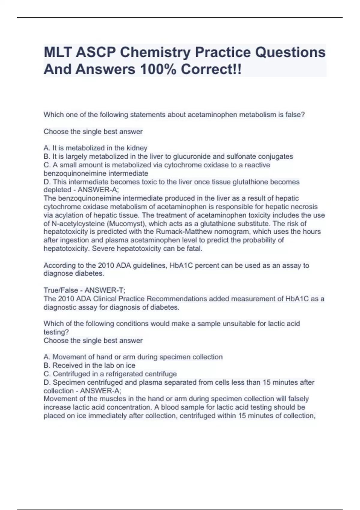 MLT ASCP Chemistry Practice Questions And Answers 1 Which one of the following statements about acetaminophen metabolism is false? Choose the single best answer A. It is metabolized in the kidney B. It is largely metabolized in the liver to glucuronide and sulfonate conjugates C. A small amount is metabolized via cytochrome oxidase to a reactive benzoquinoneimine intermediate D. This intermediate becomes toxic to the liver once tissue glutathione becomes depleted - ANSWER-A; The benzoquinoneimine intermediate produced in the liver as a result of hepatic cytochrome oxidase metabolism of acetaminophen is responsible for hepatic necrosis via acylation of hepatic tissue. The treatment of acetaminophen toxicity includes the use of N-acetylcysteine (Mucomyst), which acts as a glutathione substitute. The risk of hepatotoxicity is predicted with the Rumack-Matthew nomogram, which uses the hours after ingestion and plasma acetaminophen level to predict the probability of hepatotoxicity. Severe hepatotoxicity can be fatal. According to the 2010 ADA guidelines, HbA1C percent can be used as an assay to diagnose diabetes. True/False - ANSWER-T; The 2010 ADA Clinical Practice Recommendations added measurement of HbA1C as a diagnostic assay for diagnosis of diabetes. Which of the following conditions would make a sample unsuitable for lactic acid testing? Choose the single best answer A. Movement of hand or arm during specimen collection B. Received in the lab on ice C. Centrifuged in a refrigerated centrifuge D. Specimen centrifuged and plasma separated from cells less than 15 minutes after collection - ANSWER-A; Movement of the muscles in the hand or arm during specimen collection will falsely increase lactic acid concentration. A blood sample for lactic acid testing should be 00% Correct!!