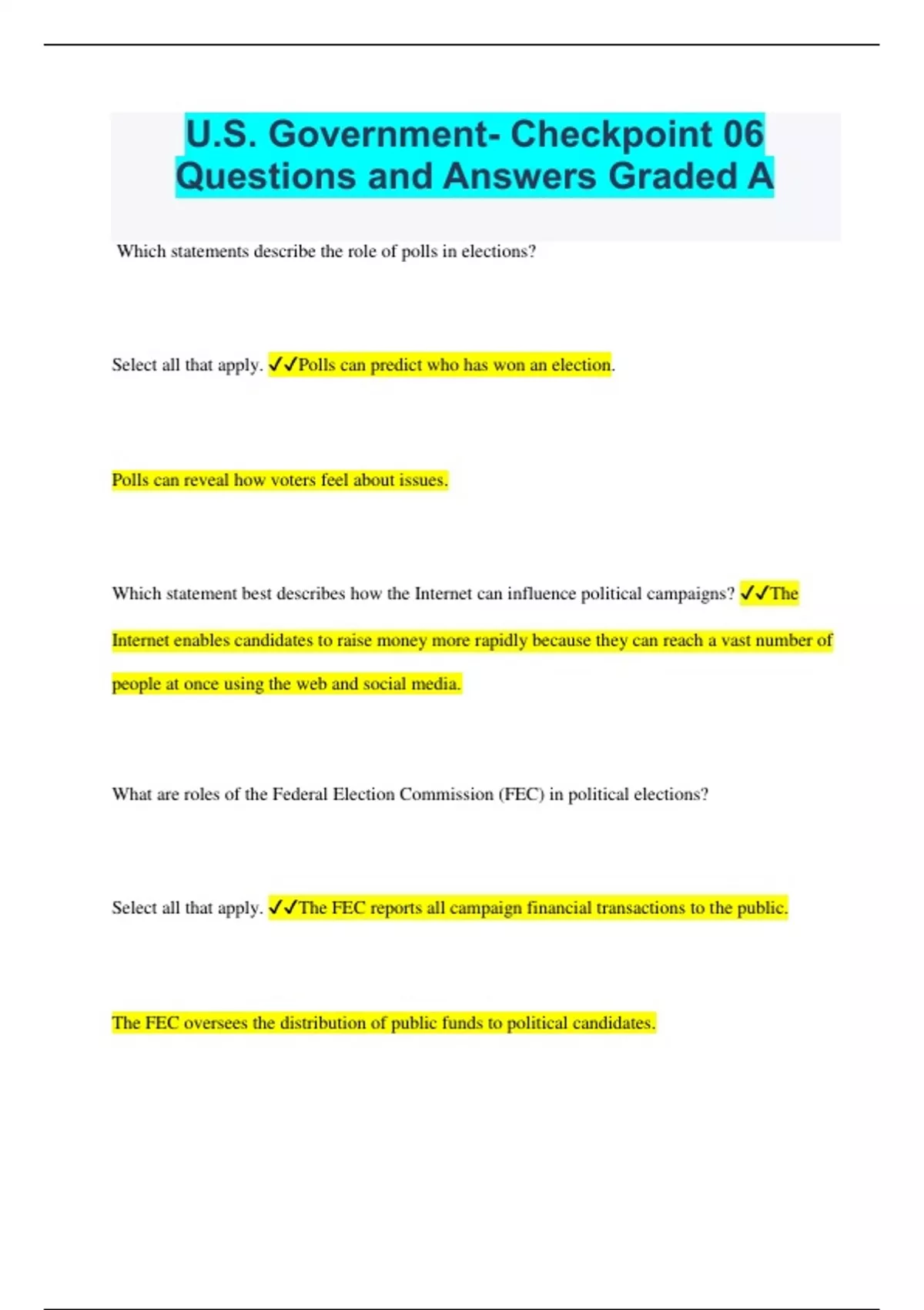 U.S. Government- Checkpoint 06 Questions and Answers Graded A Which statements describe the role of polls in elections? Select all that apply. Polls can predict who has won an election. Polls can reveal how voters feel about issues. Which statement best describes how the Internet can influence political campaigns? The Internet enables candidates to raise money more rapidly because they can reach a vast number of people at once using the web and social media. What are roles of the Federal Election Commission (FEC) in political elections? Select all that apply. The FEC reports all campaign financial transactions to the public. The FEC oversees the distribution of public funds to political candidates. Which activities represent ways in which political parties and special interest groups help citizens legally express their needs? Select all that apply. engaging in planned protests participating in political campaigns Which statement best describes the difference between an open and a closed primary? Only voters who are registered members of a party can vote in a closed primary, while independent voters can vote in open primaries. Which ideas align with the Federalist platform? Select all that apply. strong central government economic improvements and protections