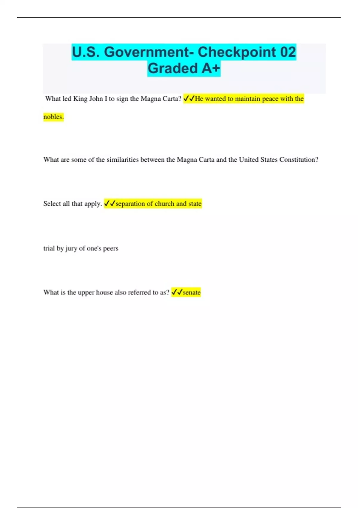 U.S. Government- Checkpoint 02 Graded A+ What led King John I to sign the Magna Carta? He wanted to maintain peace with the nobles. What are some of the similarities between the Magna Carta and the United States Constitution? Select all that apply. separation of church and state trial by jury of one's peers What is the upper house also referred to as? senate