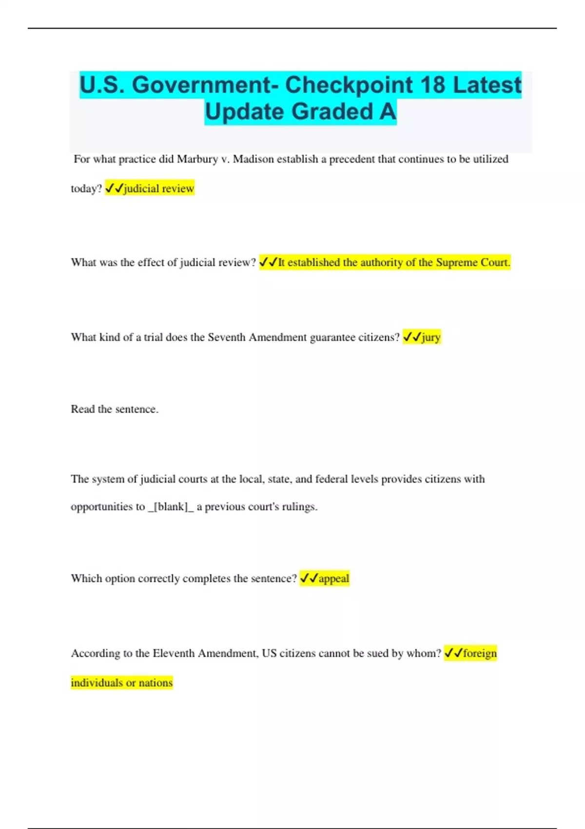 U.S. Government- Checkpoint 18 Latest Update Graded A For what practice did Marbury v. Madison establish a precedent that continues to be utilized today? judicial review What was the effect of judicial review? It established the authority of the Supreme Court. What kind of a trial does the Seventh Amendment guarantee citizens? jury Read the sentence. The system of judicial courts at the local, state, and federal levels provides citizens with opportunities to _[blank]_ a previous court's rulings. Which option correctly completes the sentence? appeal According to the Eleventh Amendment, US citizens cannot be sued by whom? foreign individuals or nations