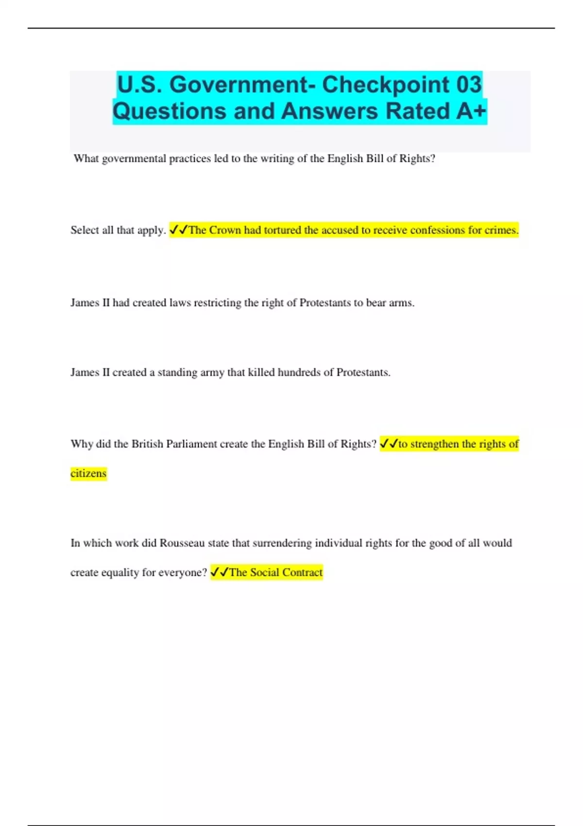 U.S. Government- Checkpoint 03 Questions and Answers Rated A+ What governmental practices led to the writing of the English Bill of Rights? Select all that apply. The Crown had tortured the accused to receive confessions for crimes. James II had created laws restricting the right of Protestants to bear arms. James II created a standing army that killed hundreds of Protestants. Why did the British Parliament create the English Bill of Rights? to strengthen the rights of citizens In which work did Rousseau state that surrendering individual rights for the good of all would create equality for everyone? The Social Contract