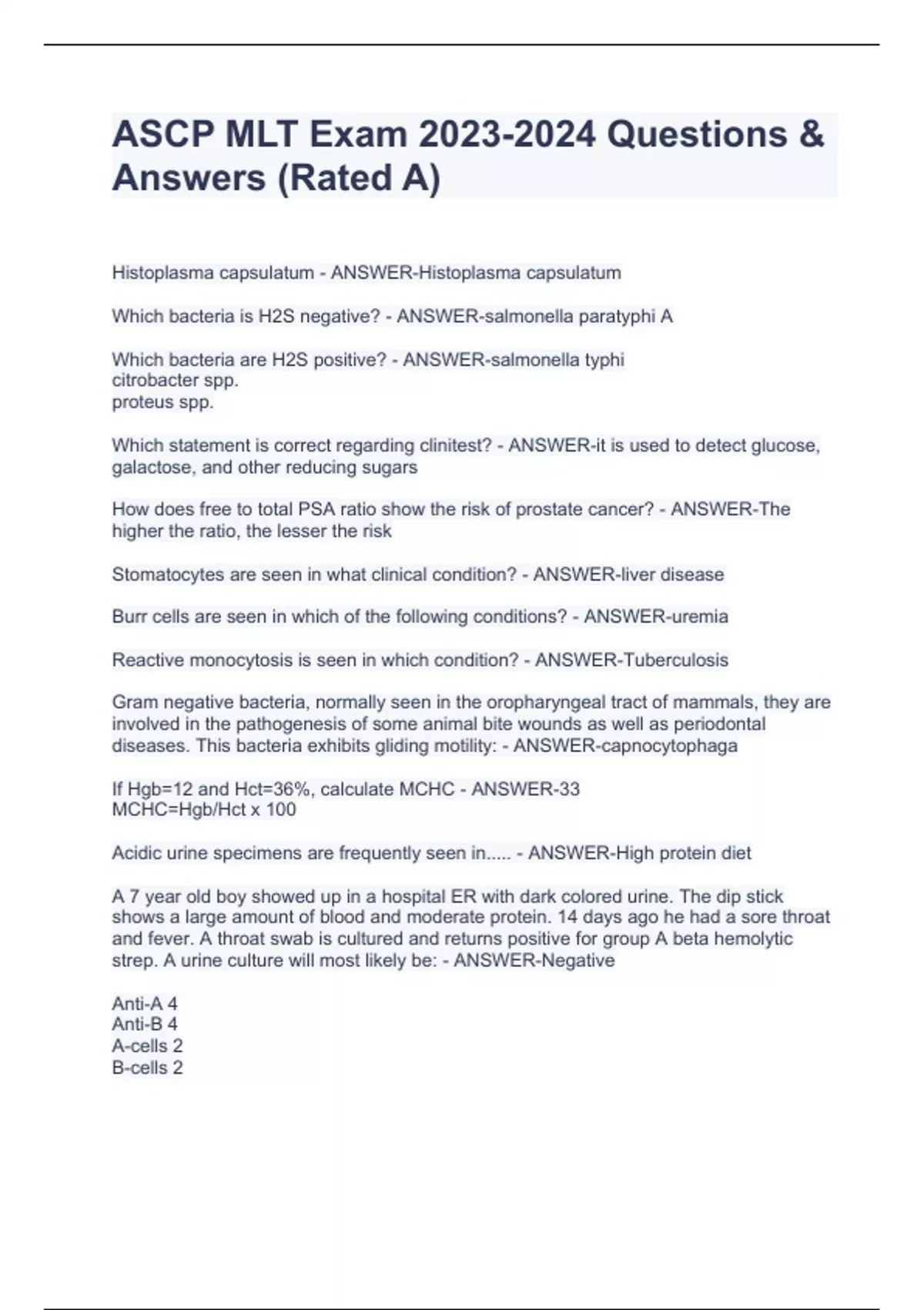 Histoplasma capsulatum - ANSWER-Histoplasma capsulatum Which bacteria is H2S negative? - ANSWER-salmonella paratyphi A Which bacteria are H2S positive? - ANSWER-salmonella typhi citrobacter spp. proteus spp. Which statement is correct regarding clinitest? - ANSWER-it is used to detect glucose, galactose, and other reducing sugars How does free to total PSA ratio show the risk of prostate cancer? - ANSWER-The higher the ratio, the lesser the risk Stomatocytes are seen in what clinical condition? - ANSWER-liver disease Burr cells are seen in which of the following conditions? - ANSWER-uremia Reactive monocytosis is seen in which condition? - ANSWER-Tuberculosis Gram negative bacteria, normally seen in the oropharyngeal tract of mammals, they are involved in the pathogenesis of some animal bite wounds as well as periodontal diseases. This bacteria exhibits gliding motility: - ANSWER-capnocytophaga If Hgb=12 and Hct=36%, calculate MCHC - ANSWER-33 MCHC