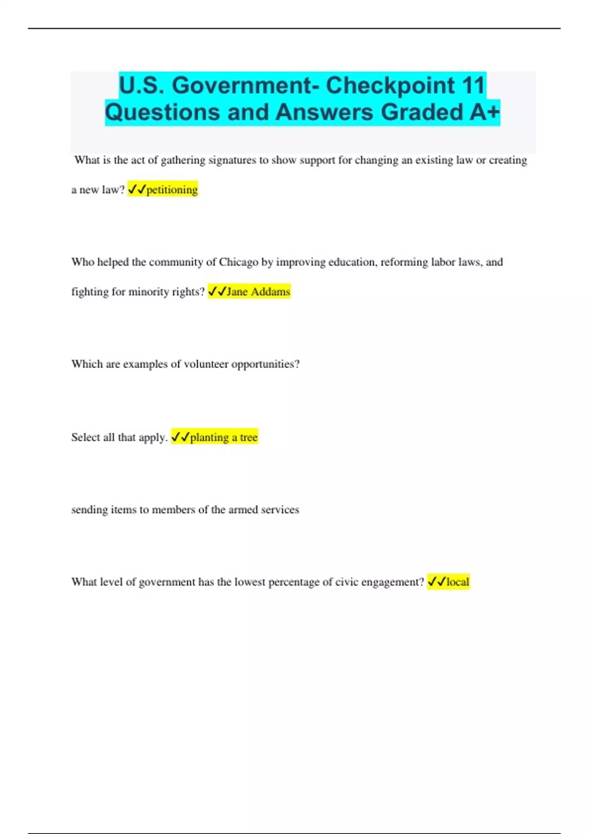 U.S. Government- Checkpoint 11 Questions and Answers Graded A+ What is the act of gathering signatures to show support for changing an existing law or creating a new law? petitioning Who helped the community of Chicago by improving education, reforming labor laws, and fighting for minority rights? Jane Addams Which are examples of volunteer opportunities? Select all that apply. planting a tree sending items to members of the armed services What level of government has the lowest percentage of civic engagement? local