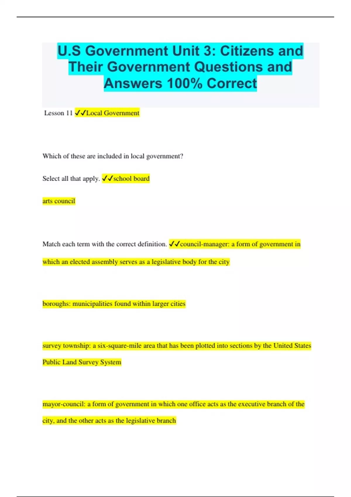 U.S Government Unit 3: Citizens and Their Government Questions and Answers 100% Correct Lesson 11 Local Government Which of these are included in local government? Select all that apply. school board arts council Match each term with the correct definition. council-manager: a form of government in which an elected assembly serves as a legislative body for the city boroughs: municipalities found within larger cities survey township: a six-square-mile area that has been plotted into sections by the United States Public Land Survey System mayor-council: a form of government in which one office acts as the executive branch of the city, and the other acts as the legislative branch megalopolis: a large city that has grown to the point that it engulfs neighboring municipalities municipality: legally organized area where people live, such as a city or town Which tax or fee are you most likely to pay to the local government on a home that you own? property tax Where did the settlement house movement start? London Read the sentence. Horace Mann believed that through _[blank]_, citizens could fully put into practice the freedoms provided through the Constitution. Which option correctly completes the sentence? education What level of government has the lowest percentage of civic engagement? local What is the act of gathering signatures to show support for changing an existing law or creating a new law? petitioning Which are examples of volunteer opportunities? Select all that apply. planting a tree sending items to members of the armed services Who helped the community of Chicago by improving education, reforming labor laws, and fighting for minority rights? Jane Addams Lesson 12 County Government Which power does a sheriff hold? The power to deputize groups of citizens to enforce the law Read the sentence. The duties of a justice of the peace include _[blank]_. Which options correctly complete the sentence? Select all that apply. issuing warrants performing civil marriages What are the duties of a county court judge? Select all that apply. acts as an administrator presides over cases in county court Read the sentence. One way for a megalopolis to accommodate continued population growth is to _[blank]_ areas that were previously part of a county's jurisdiction. Which option correctly completes the sentence? incorporate Read the sentence. An advantage of being incorporated into a city is the _[blank]_. Which option correctly completes the sentence? access to municipal amenities and utilities Read the sentence. In many parts of the United States, sheriffs and their deputies are responsible for patrolling and enforcing laws in the unincorporated areas within their _[blank]_ jurisdiction. Which option correctly completes the sentence? county's Which are the duties of a justice of the peace? Select all that apply. serves as officer of lower state courts examines routine traffic violations Why are some positions at the county level appointed rather than elected? Appointments allow counties to establish a set of requirements that anyone who wants the position must meet. Read the sentence. A _[blank]_ is a series of large urban areas linked together. Which option correctly completes the sentence? megalopolis Read the sentence. A _[blank]_ is a decision about a single political issue, put to the general electorate for a vote. Which option correctly completes the sentence? referendum Lesson 13 State Government Read the sentence. Three areas that most of the 50 state governments are concerned with are _[blank]_. Which option correctly completes the sentence? budget, education, and laws Match each term with the correct definition. state treasurer: serves as the state's chief financial officer secretary of state: acts as aide, or second-in-command in some states, to the governor attorney general: serves as the state's chief legal officer In most states, who serves as president of a state senate? the lieutenant governor Which process of direct democracy is used when citizens believe an official has acted unethically? recall Other than tax collection, what are forms of state revenue? Select all that apply. state bonds highway tolls In what ways can the government regulate business? Select all that apply. licensing public statutes When would a criminal case be heard in a federal court? Select all that apply. when the case involves human trafficking across state lines when the case involves transporting illegal goods across state lines Read the sentence. The power of _[blank]_ allows a governor to select certain sections of a bill to exclude from becoming law. Which option correctly completes the sentence? line-item veto Which court at the state level is the court of last resort? state supreme court What are the duties of a governor? Select all that apply. enact or veto legislation approve state budgets What are the advantages of privatization? Select all that apply. cost savings improved management of services What is it called when private businesses supply services that government has traditionally provided? privatization Which amendment states that the powers not assigned to the US government are reserved to the states? Tenth What is one way that state governments have exerted authority over federal laws? failing to enforce federal law Lesson 14 Tribal Government In what case did the Supreme Court officially recognize the Cherokee as a separate nation? Worcester v. Georgia What was the intent of Indian schools? to assimilate American Indians into North American society Why did the Great Depression lead to the Indian Reorganization Act? The Roosevelt Administration wanted to alleviate the financial dependence of American Indians on the government. Read the sentence. Blood quantum laws on a federal level were not fully realized until the _[blank]_. Which option correctly completes the sentence? Indian Reorganization Act of 1934 What basis did American Indian protesters use for occupying Alcatraz Island and Mount R