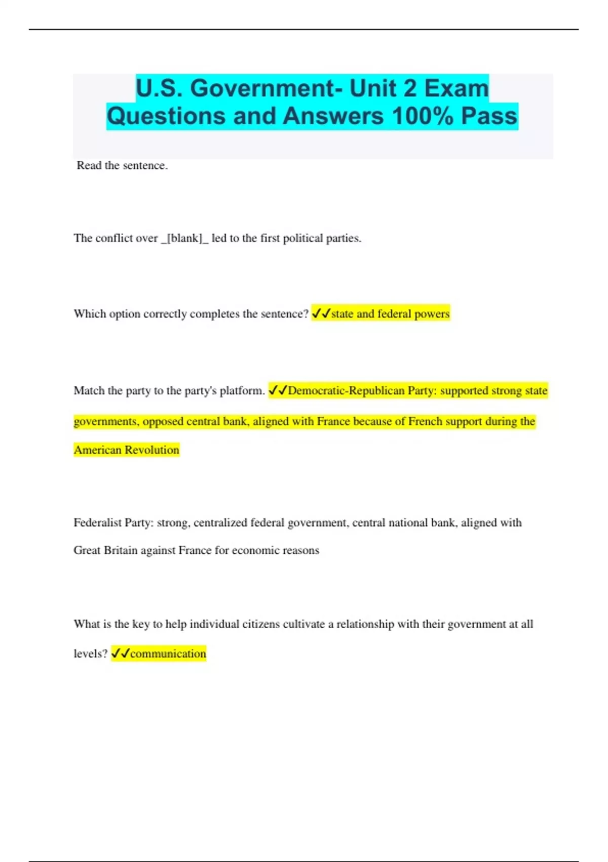 U.S. Government- Unit 2 Exam Questions and Answers 100% Pass Read the sentence. The conflict over _[blank]_ led to the first political parties. Which option correctly completes the sentence? state and federal powers Match the party to the party's platform. Democratic-Republican Party: supported strong state governments, opposed central bank, aligned with France because of French support during the American Revolution Federalist Party: strong, centralized federal government, central national bank, aligned with Great Britain against France for economic reasons What is the key to help individual citizens cultivate a relationship with their government at all levels? communication What is a basic idea of federalism? the sharing of power by a national government and state and local governments What political viewpoint does Jefferson use to refute the creation of a national bank? The federal government is overstepping its constitutional limits. Which case established federal authority to create a national bank? McCulloch v. Maryland Which case established federal authority over interstate commerce? Gibbons v. Ogden Which case stated that separate facilities for African Americans did not violate the Fourteenth Amendment? Plessy v. Ferguson How did the idea of states' rights become altered? Southern states wanted to protect slave owners' rights to own slaves. What actions did African Americans take to negate the effects of segregation? Select all that apply. boycotts sit-ins Which case overturned the judicial ruling that separate facilities for minorities were equal? Brown v. Board of Education How did women's suffrage leaders believe that the Seneca Falls Convention would promote their political goals? They believed that protesting the government would help them achieve the goal of universal suffrage. How did the League of United Latin American Citizens promote civil rights for Latino Americans? It believed that through unification and proving that Latino Americans were patriotic to the United States, it could promote equality. What was the significance of the American Indian Movement (AIM) political movement of the late 20th century? The movement promoted awareness for improved civil rights of American Indians. Why did the Equal Rights Amendment fail to be ratified by the state legislatures? A political movement headed by Phyllis Schlafly grew against the ERA. What is the purpose of a grassroots movement? It provides ordinary citizens with a voice in their local government. What is the significance of trade union workers joining forces? They realized that through collective efforts they had a more powerful voice when negotiating with companies. Which of these laws are examples of social welfare? Select all that apply. Medicare and the Social Security Act No Child Left Behind and the Elementary and Secondary Education Act What is a referendum? a decision about a single political issue, put to the general electorate for a vote Which example is a corruption of the grassroots movement? Corporations have begun using and even creating grassroots organizations for their own objectives.