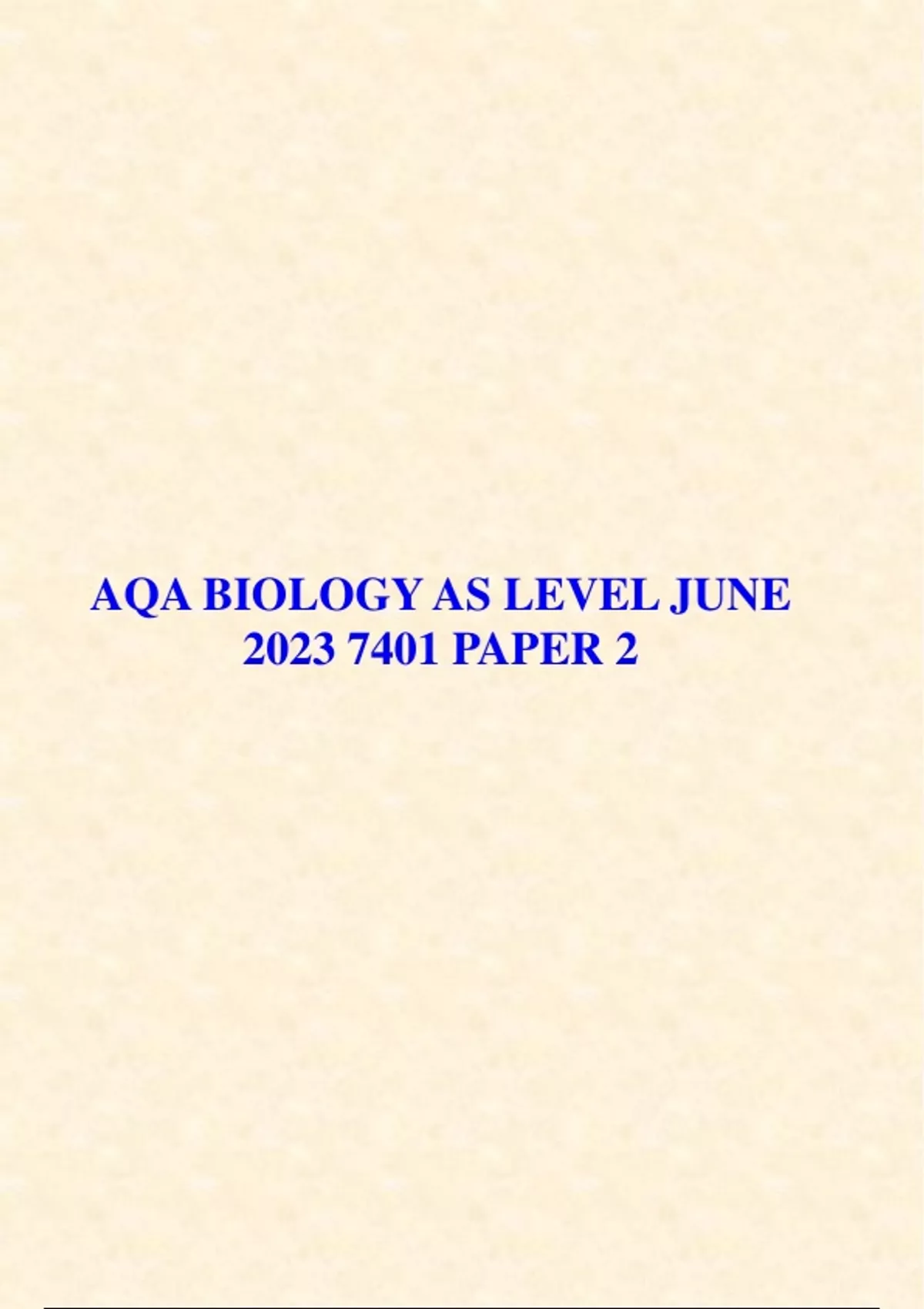 AQA BIOLOGY AS LEVEL JUNE 2023 7401 PAPER 2 For Examiner’s Use Question Mark 1 2 3 4 5 6 7 8 9 10 TOTAL Please write clearly in block capitals. Centre number Candidate number Surna me Forena me(s) Candidate signature I declare this is my own work. AS BIOLOGY Paper 2 Thursday 25 May 2023 Morning Time allowed: 1 hour 30 minutes Materials For this paper you must have: • a ruler with millimetre measurements • a scientific calculator. Instruc tions • Use black ink or black ball-point pen. • Fill in the boxes at the top of this page. • Answer all question s. • You must answer the questions in the spaces provided. Do not write outside the box around each page or on blank pages. • If you need extra space for your answer(s), use the lined pages at the end of this book. Write the question number again st your answer(s). • Show all your working. • Do all rough work in this book. Cross through any work you do not want to be marked. Informati on • The marks for the questions are shown in brackets. • The maximum mark for this paper is 75. *JUN237401201* 7401/2 *2* IB/M/Jun23 /7401/2 0 1 . 1 Which statement about the function of ribosomes is correct? Tick (✓) one box. Site of transcription, catalyse the joining of amino acids by hydrolysis reactions Site of transcription, catalyse the joining of nucleotides by condensat ion reactions Site of translation, catalyse the joining of amino acids by condensat ion reactions Site of translation, catalyse the joining of nucleotides by hydrolysis reactions 0 1 . 2 Name two biologi cal molecules that can be coded for by a gene. Do not include a polypeptide or protein in your answer. 2 Answer all questions in the spaces provided. Do not write outside the box [1 mark] [1 mark] 1 2