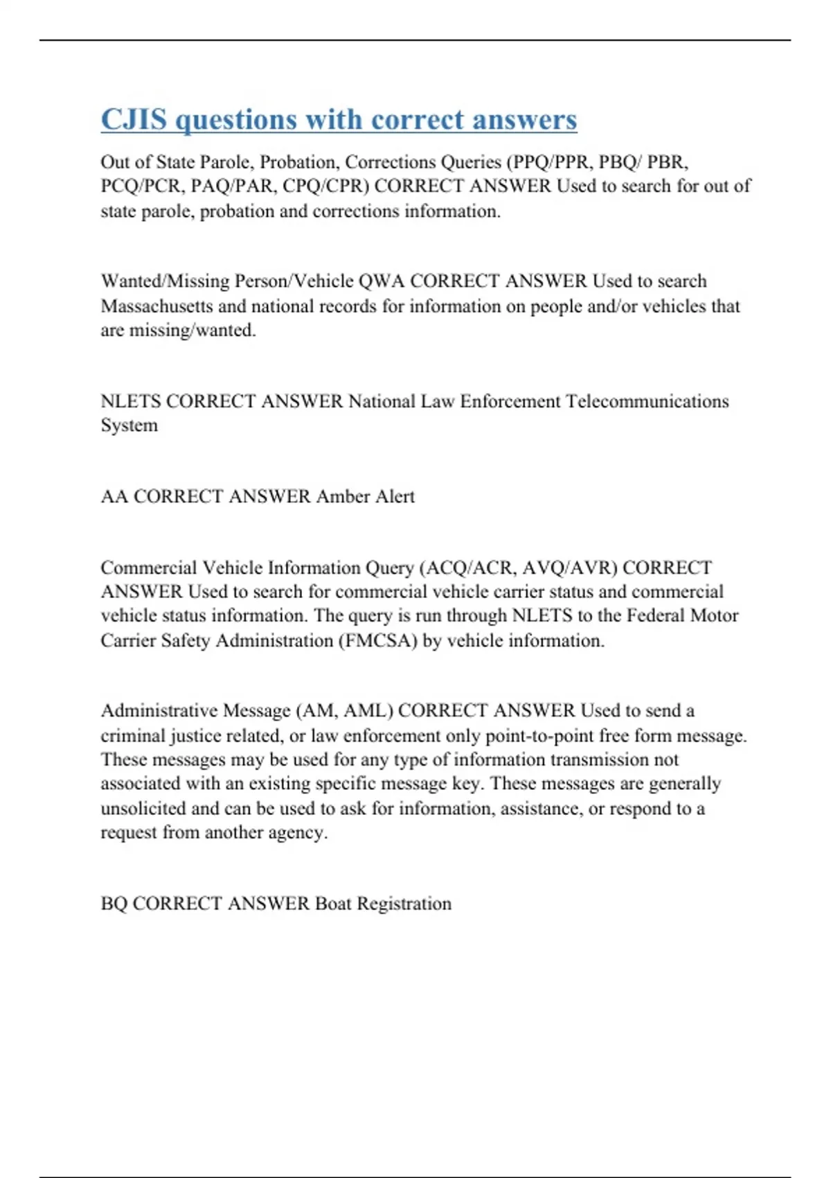 Out of State Parole, Probation, Corrections Queries (PPQ/PPR, PBQ/ PBR, PCQ/PCR, PAQ/PAR, CPQ/CPR) CORRECT ANSWER Used to search for out of state parole, probation and corrections information. Wanted/Missing Person/Vehicle QWA CORRECT ANSWER Used to search Massachusetts and national records for information on people and/or vehicles that are missing/wanted. NLETS CORRECT ANSWER National Law Enforcement Telecommunications System AA CORRECT ANSWER Amber Alert Commercial Vehicle Information Query (ACQ/ACR, AVQ/AVR) CORRECT ANSWER Used to search for commercial vehicle carrier status and commercial vehicle status information. The query is run through NLETS to the Federal Motor Carrier Safety Administration (FMCSA) by vehicle information. Administrative Message (AM, AML) CORRECT ANSWER Used to send a criminal justice related, or law enforcement only point-to-point free form message. These messages may be used for any type of information transmission not associated with an existing specific message key. These messages are generally unsolicited and can be used to ask for information, assistance, or respond to a request from another agency. BQ CORRECT ANSWER Boat Registration