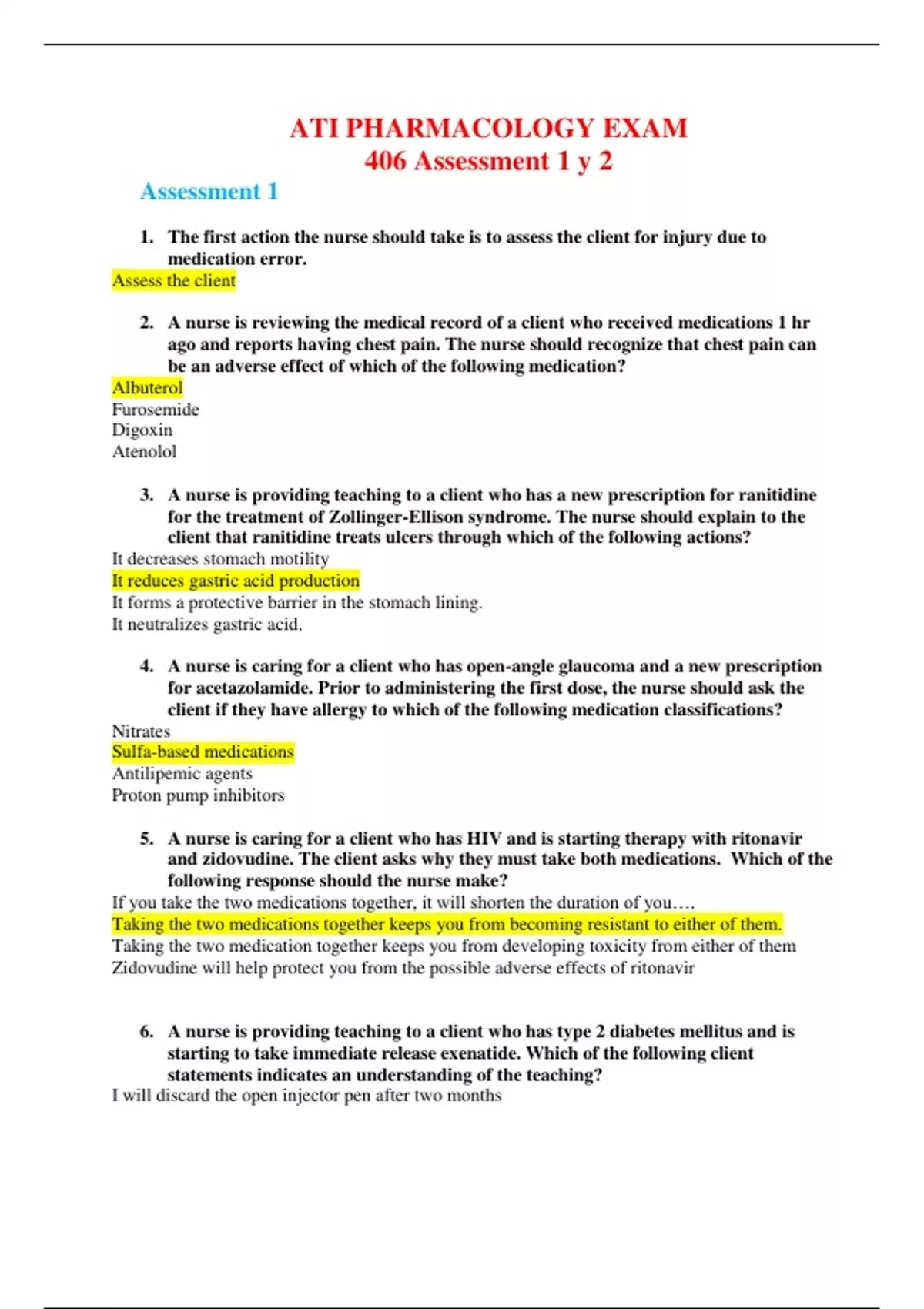 ATI PHARMACOLOGY EXAM 406 Assessment 1 y 2 Assessment 1 1. The first action the nurse should take is to assess the client for injury due to medication error. Assess the client 2. A nurse is reviewing the medical record of a client who received medications 1 hr ago and reports having chest pain. The nurse should recognize that chest pain can be an adverse effect of which of the following medication? Albuterol Furosemide Digoxin Atenolol 3. A nurse is providing teaching to a client who has a new prescription for ranitidine for the treatment of Zollinger-Ellison syndrome. The nurse should explain to the client that ranitidine treats ulcers through which of the following actions? It decreases stomach motility It reduces gastric acid production It forms a protective barrier in the stomach lining. It neutralizes gastric acid. 4. A nurse is caring for a client who has open-angle glaucoma and a new prescription for acetazolamide. Prior to administering the first dose, the nurse should ask the client if they have allergy to which of the following medication classifications? Nitrates Sulfa-based medications Antilipemic agents Proton pump inhibitors 5. A nurse is caring for a client who has HIV and is starting therapy with ritonavir and zidovudine. The client asks why they must take both medications. Which of the following response should the nurse make? If you take the two medications together, it will shorten the duration of you…. Taking the two medications together keeps you from becoming resistant to either of them. Taking the two medication together keeps you from developing toxicity from either of them Zidovudine will help protect you from the possible adverse effects of ritonavir 6. A nurse is providing teaching to a client who has type 2 diabetes mellitus and is starting to take immediate release exenatide. Which of the following client statements indicates an understanding of the teaching? I will discard the open injector pen after two months I will inject the medication into the muscle of my thigh I will store open injector pens at room temperature I will take this medication one hour before morning and evening meals. 7. A nurse is providing teaching to a client who has a new prescription for folic acid. The client states I thought that was only given during pregnancy. Which of the following statements should the nurse make? Folic acid is important for stimulating the immune system Folic acid is given to increase the absorption of the medication Folic acid is administered to minimize the manifestations of benign prostatic hyperplasia Folic acid important for the building of blood cells. 8. A nurse in the PACU is caring for a client who has received general anesthesia and has manifestation of malignant hyperthermia. Which of the following medications should the nurse expect to administer? Diazepam Dantrolene Cyclobenzaprine Metaxalone 9. A nurse is caring for a client who refuses a prescribed influenza immunization. Which of the following actions should the nurse take first? Contact the provider who prescribed the immunization Ask the client to describe their concerns Provide the client with education about the immunization Document the client refusal of the immunization 10. A nurse is caring for a client who has a prescription for a hypotonic Iv fluid. Which of the following solution the nurse expects to administer? 0.45% sodium chloride 0.9% sodium chloride 3% sodium chloride Lactated ringers 11. A nurse in an emergency department is caring for a client who has a new prescription for acetylcysteine. For which of the following condition should the nurse expect to administer this medication? Gastrointestinal bleed Acute bronchospasm Morphine toxicity Acetaminophen toxicity 12. A nurse is obtaining vital signs for a client who has been taking propranolol. Which of the following finding should the nurse identify as an adverse effect of the medication? Respiratory rate 20/min Oral temperature 37.8 Blood pressure 118/78 mm Apical pulse 50 /min 13. A nurse is providing teaching to a client who has neuropathic pain and a new prescription for amitriptyline once per day. Which of the following information should the nurse include in the teaching? Increase fluids while taking the medication Expect an elevation in blood pressure with initial doses of the medication Stop the medication immediately if urine becomes orange in color Take the medication in the morning 14. A nurse is providing teaching to a client who has a new prescription for oral extended-release potassium chloride tablets. Which of the following instructions should the nurse include in the teaching? Do not crush this medication Dissolve the tablet in your mouth Take this medication on an empty stomach Take this medication every other day 15. A nurse is providing teaching to a client who has a new prescription for levothyroxine. Which of the following statements by the client indications an understanding of the teaching? I should take this medication with food I will take three doses each day I might not realize the full effect of the medication for several weeks I might gain weight while taking this medication if I do not exercise 16. While assessing a client at the beginning of the shift a nurse notes that the client received a medication in error from the nurse on the previous shift. At which of the following times should the nurse plan to complete an incident report about the error? After the end of the current shift After contacting risk management As soon as the assessment is complete As soon as the nurse from the previous shift has been informed 17. A nurse is preparing to administer a second unit of packed RBCs to a client who is experiencing hemorrhagic shock. The nurse should monitor the client for which of the following manifestation as an indication of circulatory overload? Chills Wheezing Dyspnea Flushing 18. A nurse is planning care for a client who has neutropenia. Which of the following medication should the nurse exp