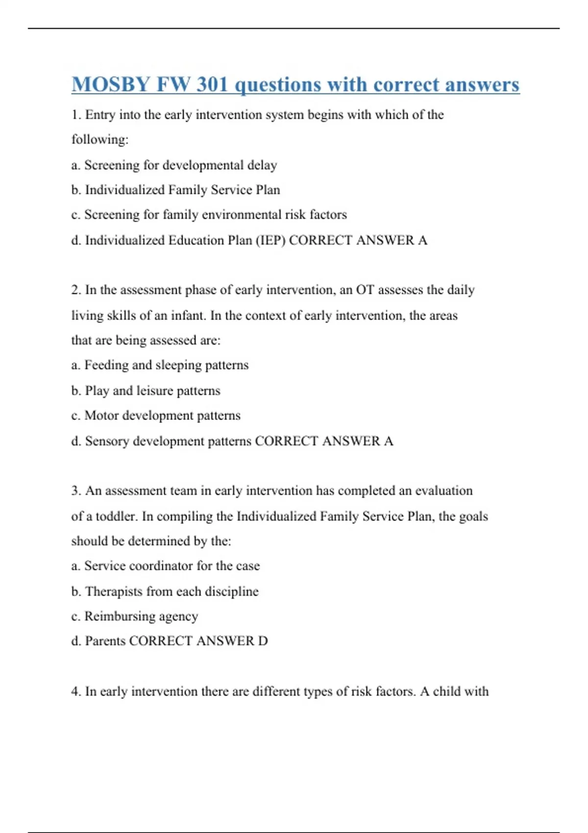 1. Entry into the early intervention system begins with which of the following: a. Screening for developmental delay b. Individualized Family Service Plan c. Screening for family environmental risk factors d. Individualized Education Plan (IEP) CORRECT ANSWER A 2. In the assessment phase of early intervention, an OT assesses the daily living skills of an infant. In the context of early intervention, the areas that are being assessed are: a. Feeding and sleeping patterns b. Play and leisure patterns c. Motor development patterns d. Sensory development patterns CORRECT ANSWER A 3. An assessment team in early intervention has completed an evaluation of a toddler. In compiling the Individualized Family Service Plan, the goals should be determined by the: a. Service coordinator for the case b. Therapists from each discipline c. Reimbursing agency d. Parents CORRECT ANSWER D 4. In early intervention there are differen