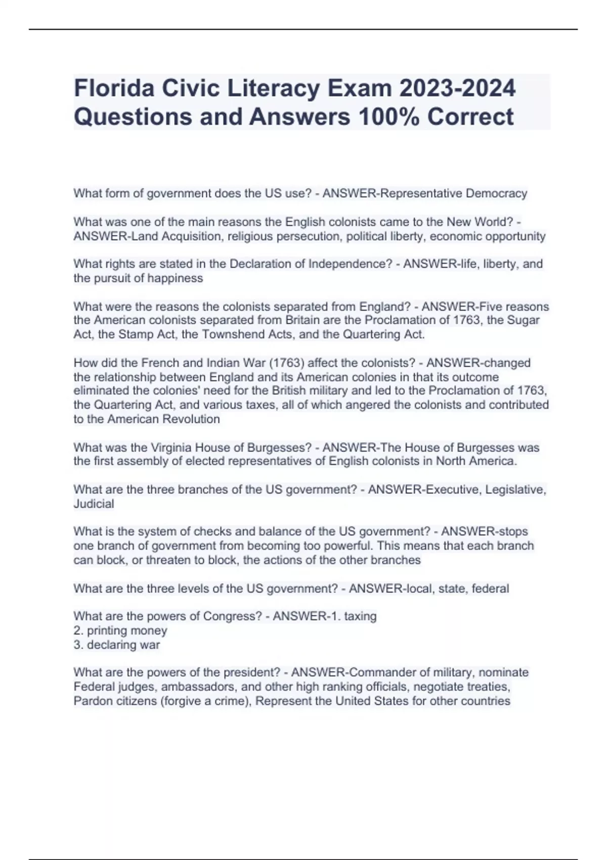 Florida Civic Literacy Exam Questions and Answers 100% CorrectFlorida Civic Literacy Exam Questions and Answers 100% CorrectFlorida Civic Literacy Exam Questions and Answers 100% CorrectFlorida Civic Literacy Exam Questions and Answers 100% Correct What form of government does the US use? - ANSWER-Representative Democracy What was one of the main reasons the English colonists came to the New World? - ANSWER-Land Acquisition, religious persecution, political liberty, economic opportunity What rights are stated in the Declaration of Independence? - ANSWER-life, liberty, and the pursuit of happiness What were the reasons the colonists separated from England? - ANSWER-Five reasons the American colonists separated from Britain are the Proclamation of 1763, the Sugar