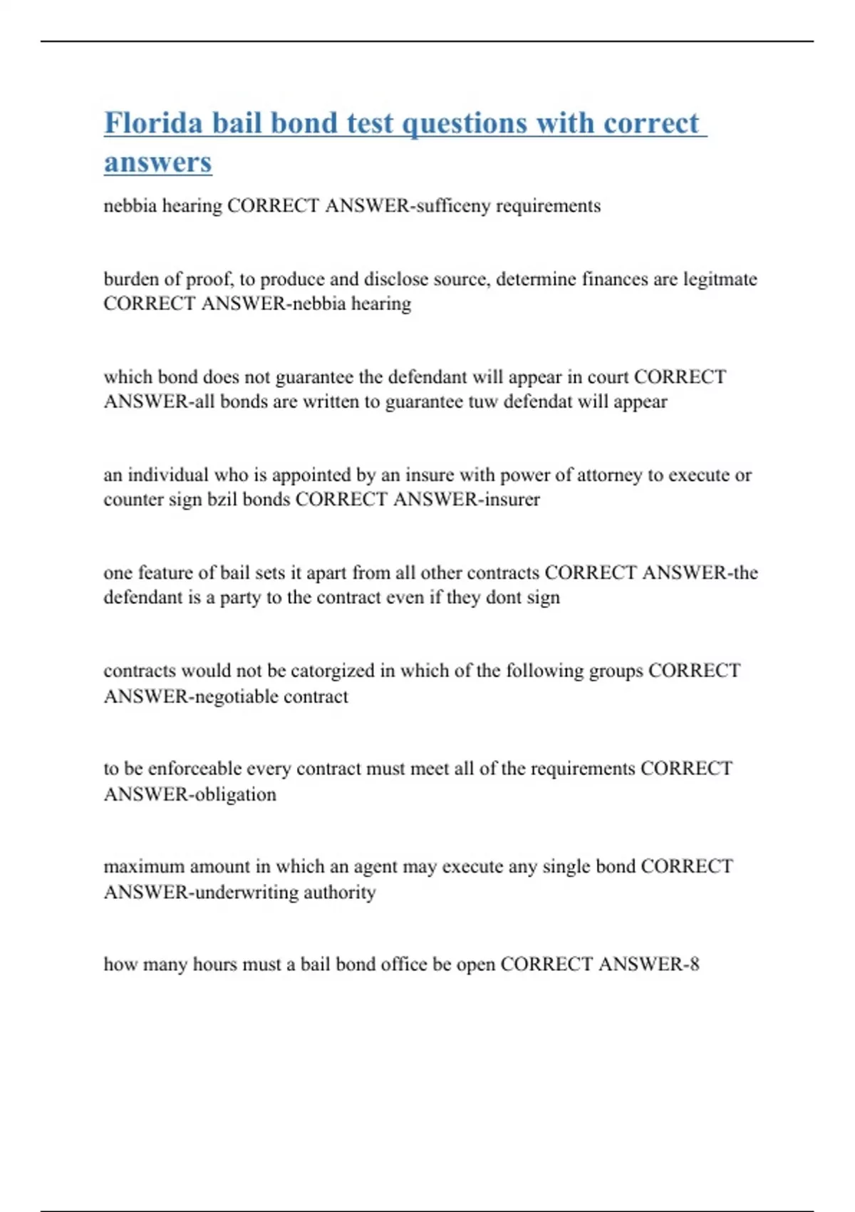 nebbia hearing CORRECT ANSWER-sufficeny requirements burden of proof, to produce and disclose source, determine finances are legitmate CORRECT ANSWER-nebbia hearing which bond does not guarantee the defendant will appear in court CORRECT ANSWER-all bonds are written to guarantee tuw defendat will appear an individual who is appointed by an insure with power of attorney to execute or counter sign bzil bonds CORRECT ANSWER-insurer one feature of bail sets it apart from all other contracts CORRECT ANSWER-the defendant is a party to the contract even if they dont sign contracts would not be catorgized in which of the following groups CORRECT ANSWER-negotiable contract to be enforceable every contract must meet all of the requirements CORRECT ANSWER-obligation maximum amount in which an agent may execute any single bond CORRECT ANSWER-underwriting authority how many hours must a bail bond office be open CORRECT ANSWER-8