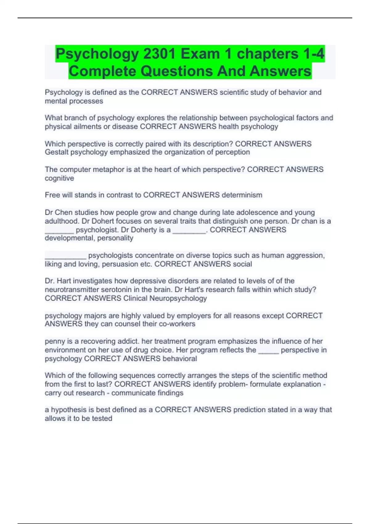 Psychology is defined as the CORRECT ANSWERS scientific study of behavior and mental processes