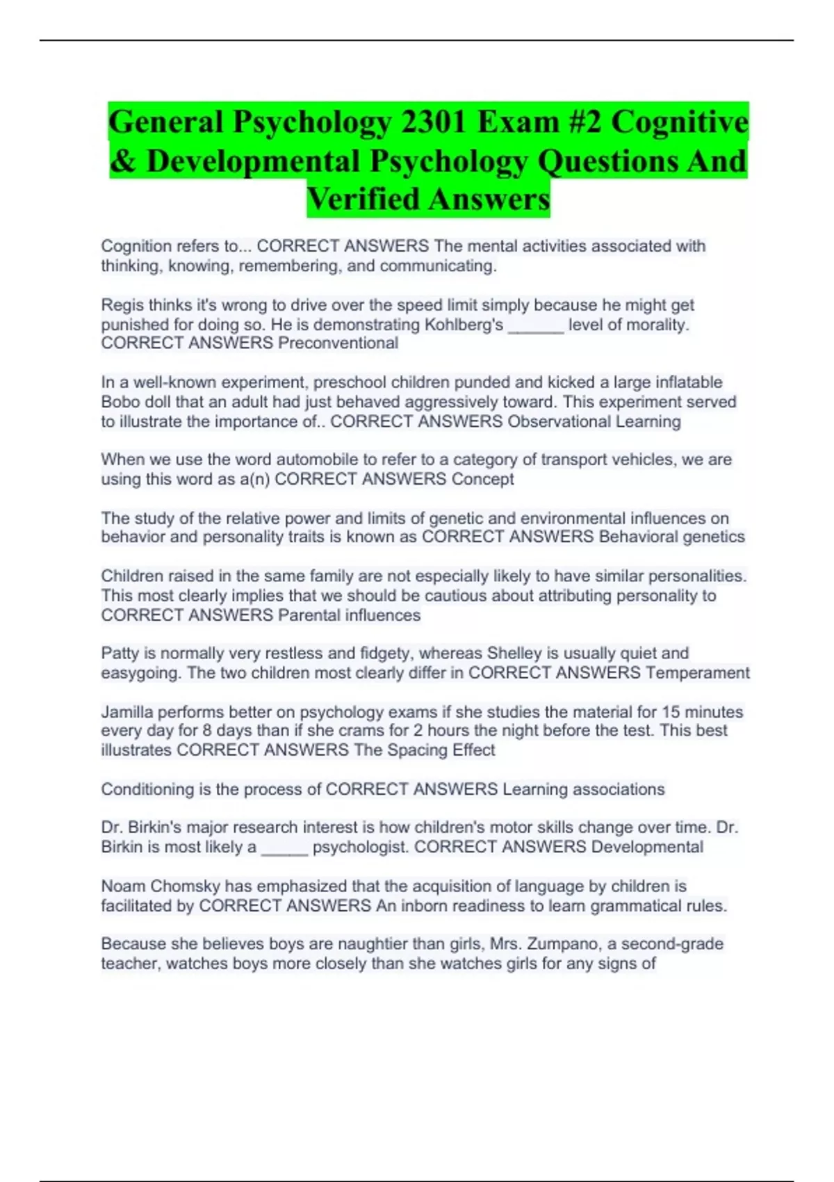 General Psychology 2301 Exam #2 Cognitive & Developmental Psychology Questions And Verified Answers