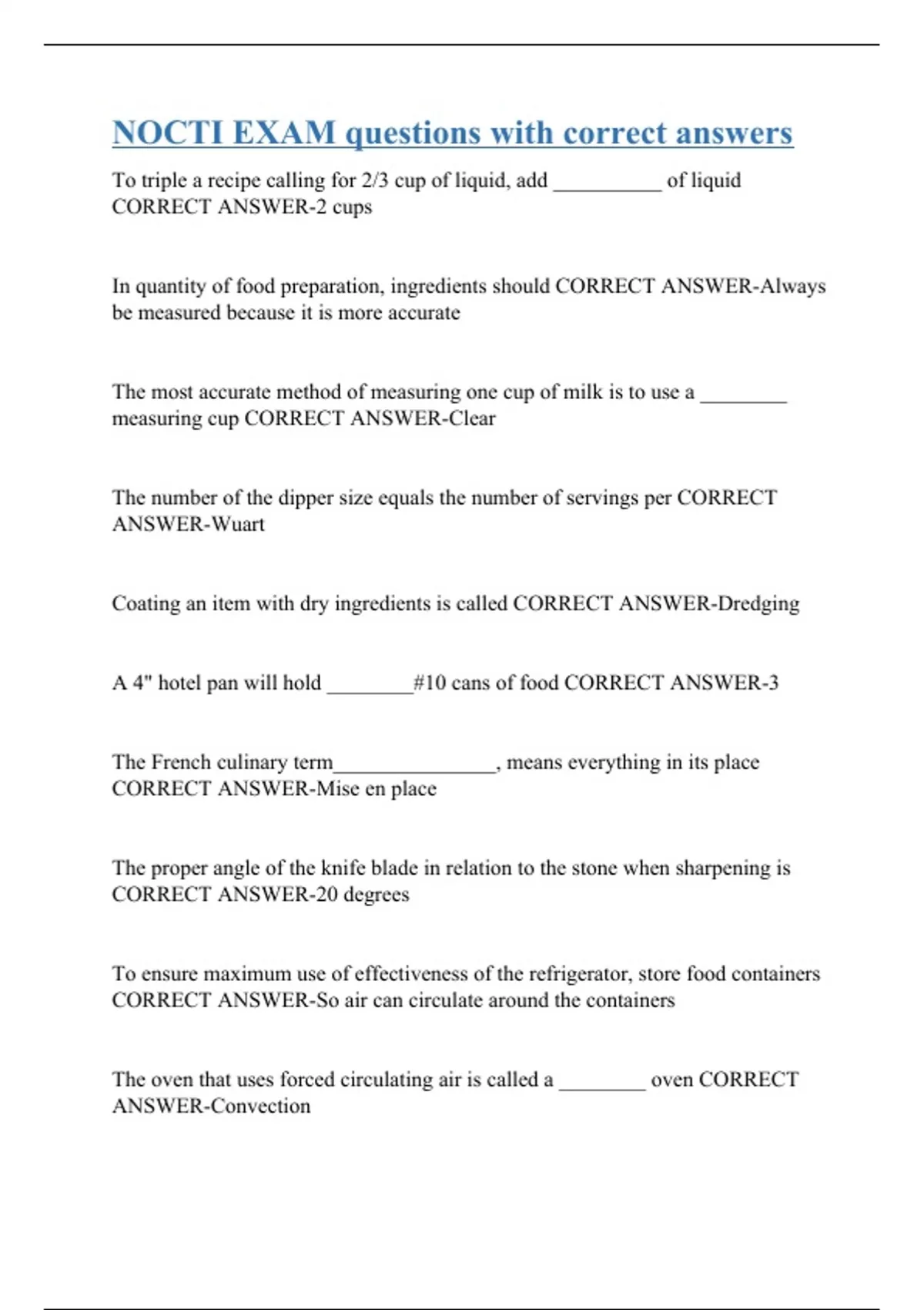 To triple a recipe calling for 2/3 cup of liquid, add __________ of liquid CORRECT ANSWER-2 cups In quantity of food preparation, ingredients should CORRECT ANSWER-Always be measured because it is more accurate The most accurate method of measuring one cup of milk is to use a ________ measuring cup CORRECT ANSWER-Clear The number of the dipper size equals the number of servings per CORRECT ANSWER-Wuart Coating an item with dry ingredients is called CORRECT ANSWER-Dredging A 4" hotel pan will hold ________#10 cans of food CORRECT ANSWER-3 The French culinary term_______________, means everything in its place CORRECT ANSWER-Mise en place The proper angle of the knife blade in relation to the stone when sharpening is CORRECT ANSWER-20 degrees To ensure maximum use of effectiveness of the refrigerator, store food containers CORRECT ANSWER-So air can circulate around the containers