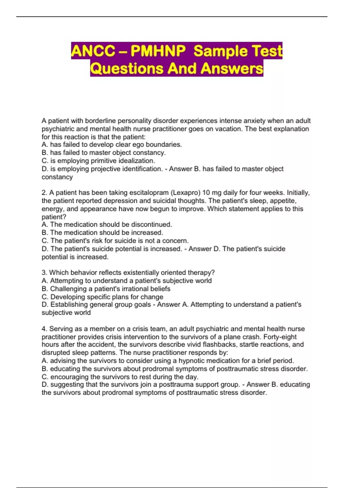 ANCC – PMHNP Sample Test Questions and verified Answers 2023