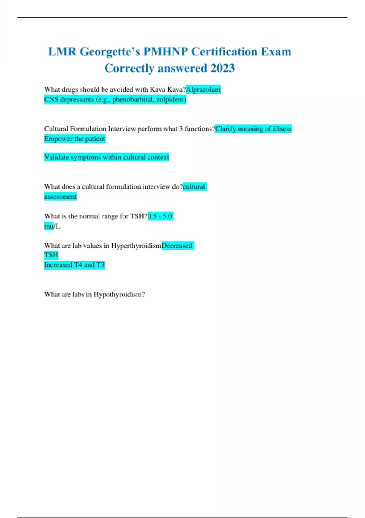 LMR Georgette’s PMHNP Certification Exam Correctly answered 2023