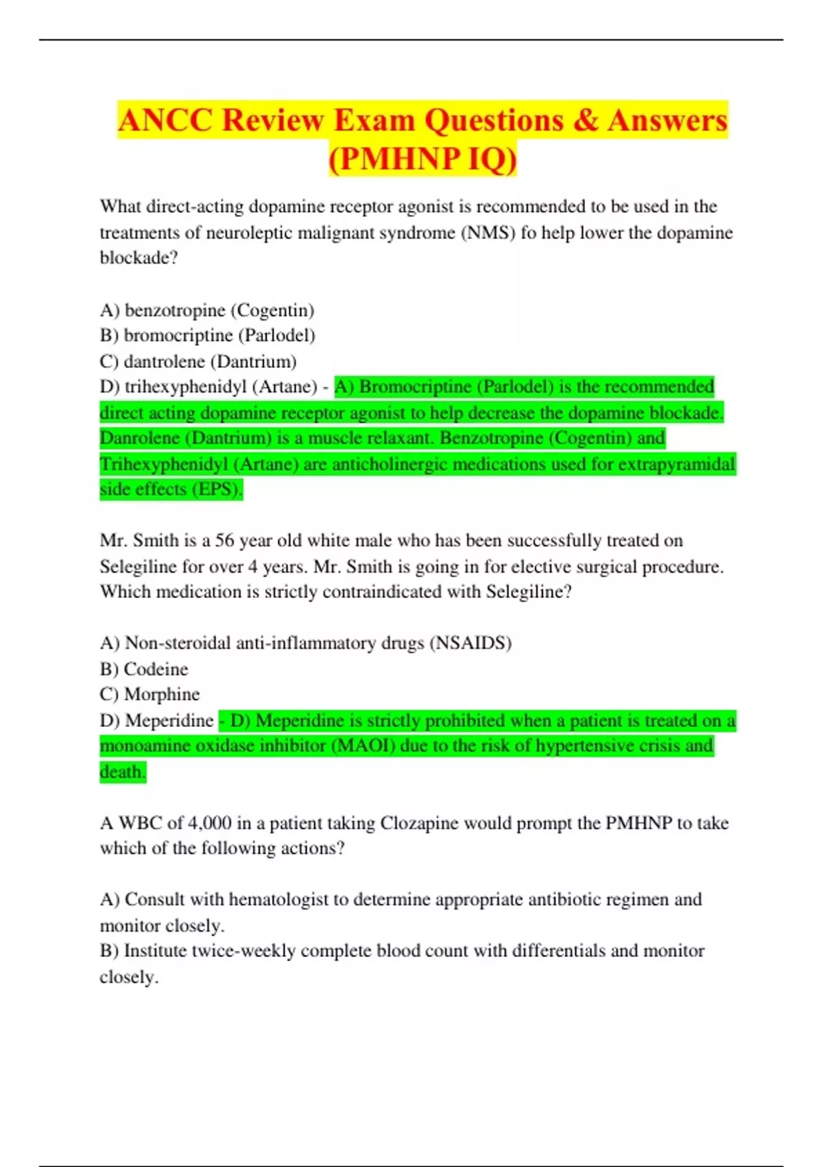ancc review exam questions correct answers pmhn