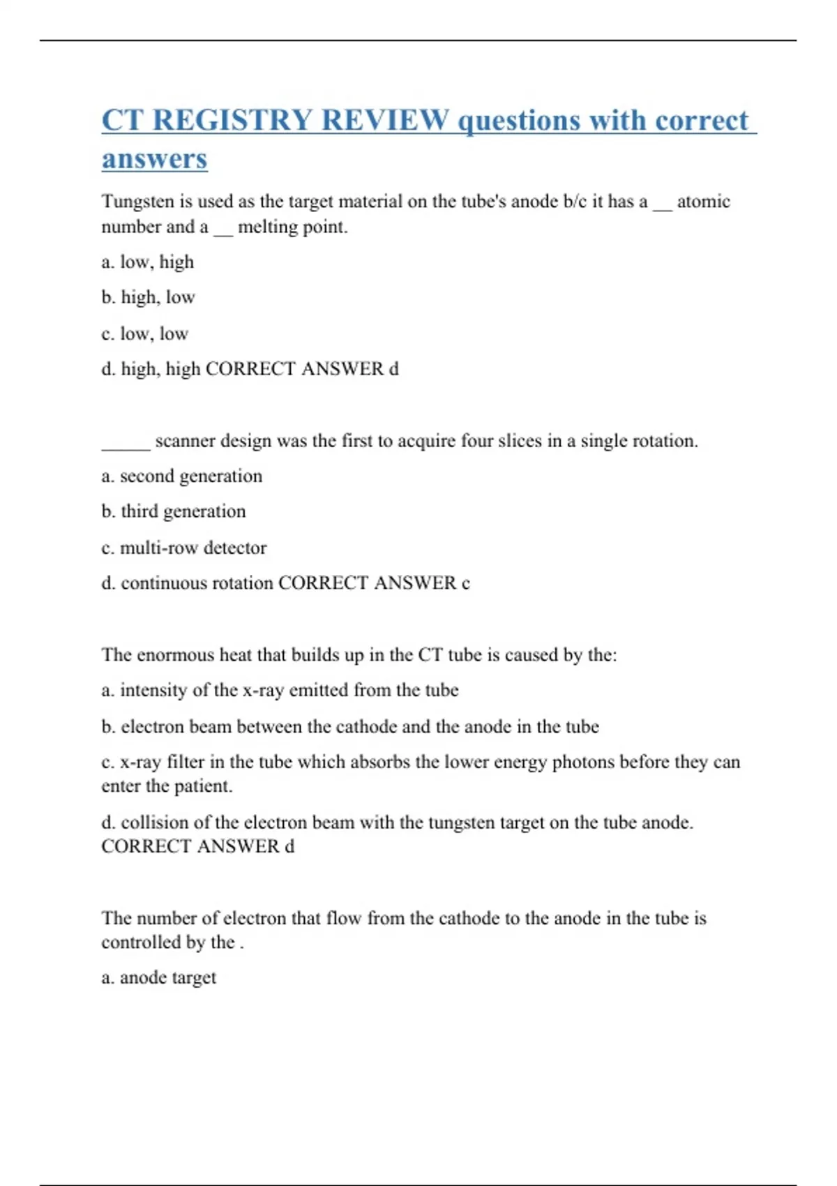 Tungsten is used as the target material on the tube's anode b/c it has a __ atomic number and a __ melting point. a. low, high b. high, low c. low, low d. high, high CORRECT ANSWER d _____ scanner design was the first to acquire four slices in a single rotation. a. second generation b. third generation c. multi-row detector d. continuous rotation CORRECT ANSWER c The enormous heat that builds up in the CT tube is caused by the: a. intensity of the x-ray emitted from the tube b. electron beam between the cathode and the anode in the tube c. x-ray filter in the tube which absorbs the lower energy photons before they can enter the patient. d. collision of the electron beam w