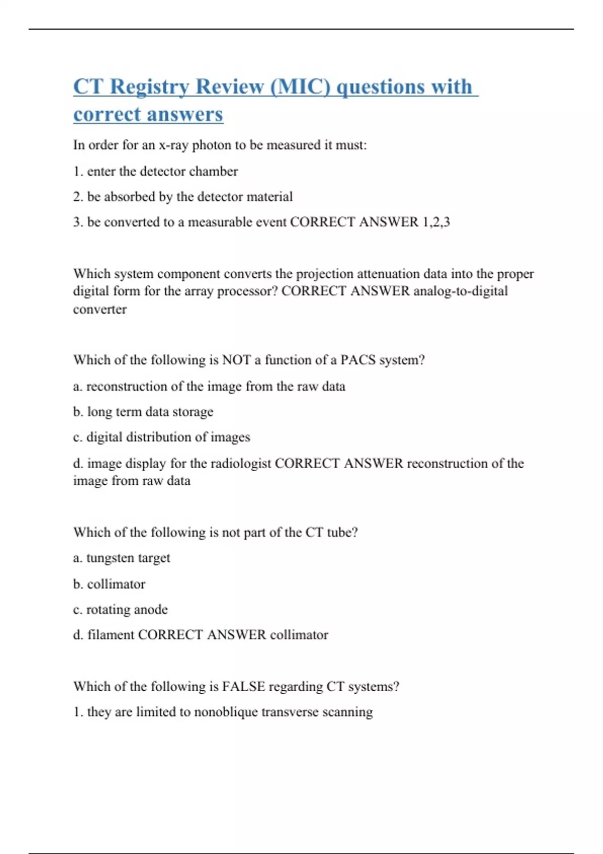 In order for an x-ray photon to be measured it must: 1. enter the detector chamber 2. be absorbed by the detector material 3. be converted to a measurable event CORRECT ANSWER 1,2,3 Which system component converts the projection attenuation data into the proper digital form for the array processor? CORRECT ANSWER analog-to-digital converter Which of the following is NOT a function of a PACS system? a. reconstruction of the image from the raw data b. long term data storage c. digital distribution of images d. image display for the radiologist CORRECT ANSWER reconstruction of the image from raw data Which of the following is not part of the CT tube? a. tungsten target b. collimator c. rotating anode d. filament CORRECT ANSWER collimator Which of the following is FALSE regarding CT systems? 1. they are limited to nonoblique t