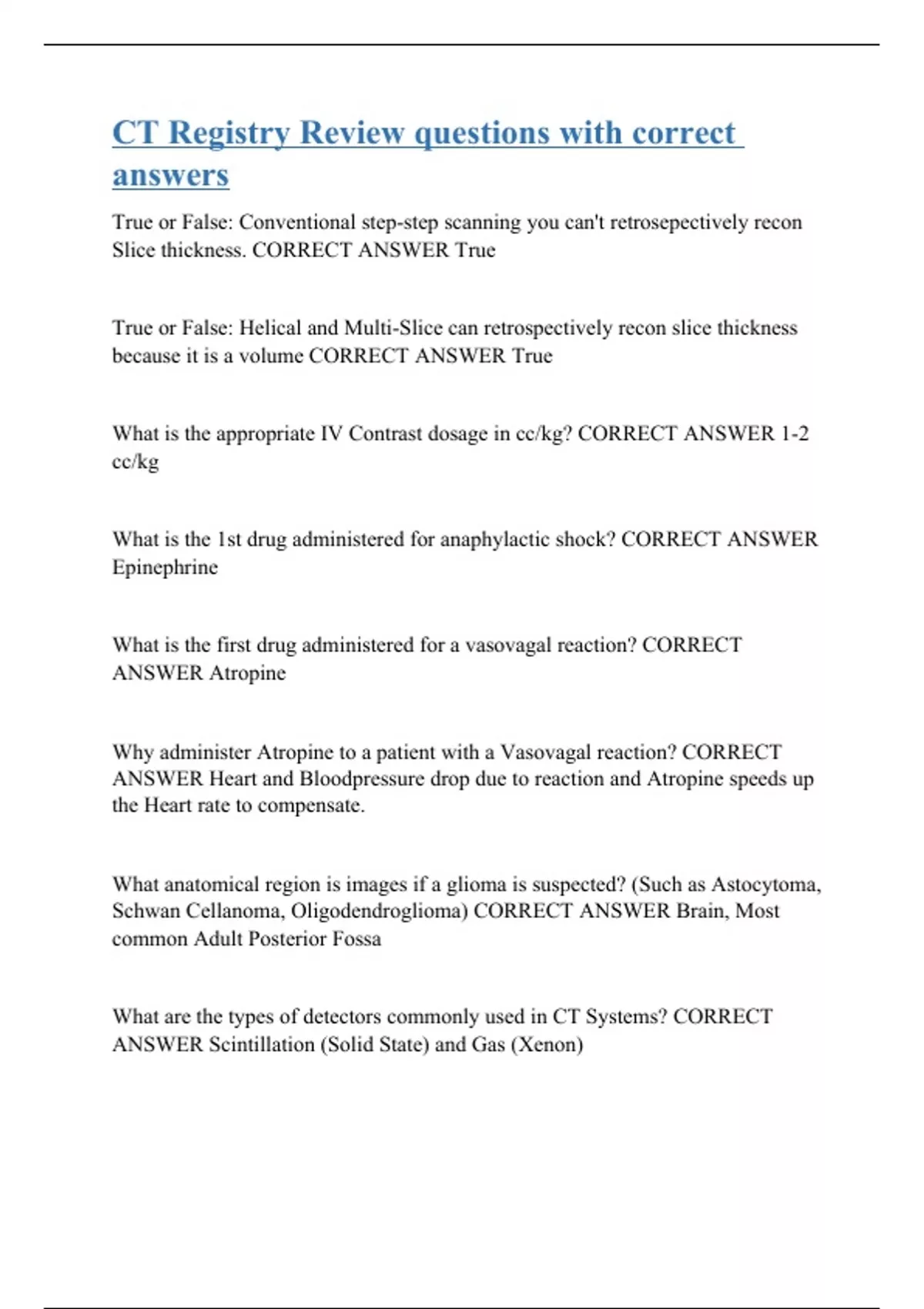 True or False: Conventional step-step scanning you can't retrosepectively recon Slice thickness. CORRECT ANSWER True True or False: Helical and Multi-Slice can retrospectively recon slice thickness because it is a volume CORRECT ANSWER True What is the appropriate IV Contrast dosage in cc/kg? CORRECT ANSWER 1-2 cc/kg What is the 1st drug administered for anaphylactic shock? CORRECT ANSWER Epinephrine What is the first drug administered for a vasovagal reaction? CORRECT ANSWER Atropine Why administer Atropine to a patient with a Vasovagal reaction? CORRECT ANSWER Heart and Bloodpressure drop due to reaction and Atropine speeds up the Heart rate to compensate. What anatomical region is images if a glioma is suspected? (Such as Astocytoma, Schwan Cellanoma, Oligodendroglioma) CORRECT ANSWER Brain, Most common Adult Posterior Fossa What are the types of detectors commonly used in CT Systems? CORRECT ANSWER Scintillation (Solid State) and Gas (Xenon)