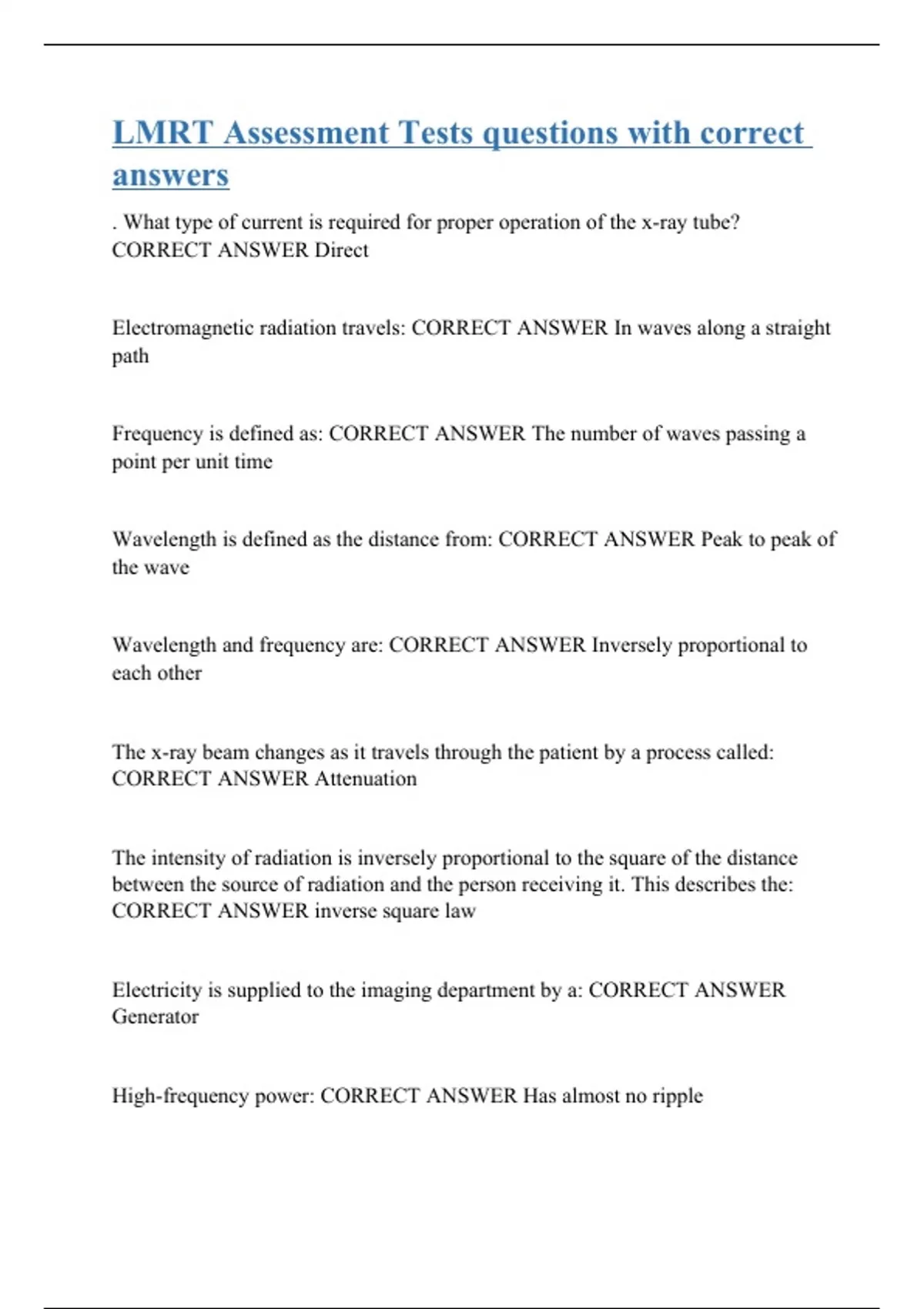 . What type of current is required for proper operation of the x-ray tube? CORRECT ANSWER Direct Electromagnetic radiation travels: CORRECT ANSWER In waves along a straight path Frequency is defined as: CORRECT ANSWER The number of waves passing a point per unit time Wavelength is defined as the distance from: CORRECT ANSWER Peak to peak of the wave Wavelength and frequency are: CORRECT ANSWER Inversely proportional to each other The x-ray beam changes as it travels through the patient by a process called: CORRECT ANSWER Attenuation The intensity of radiation is inversely proportional to the square of the distance between the source of radiation and the person receiving it. This describes the: CORRECT ANSWER inverse square law Electricity is supplied to the imaging department by a: CORRECT ANSWER Generator High-frequency power: CORRECT A