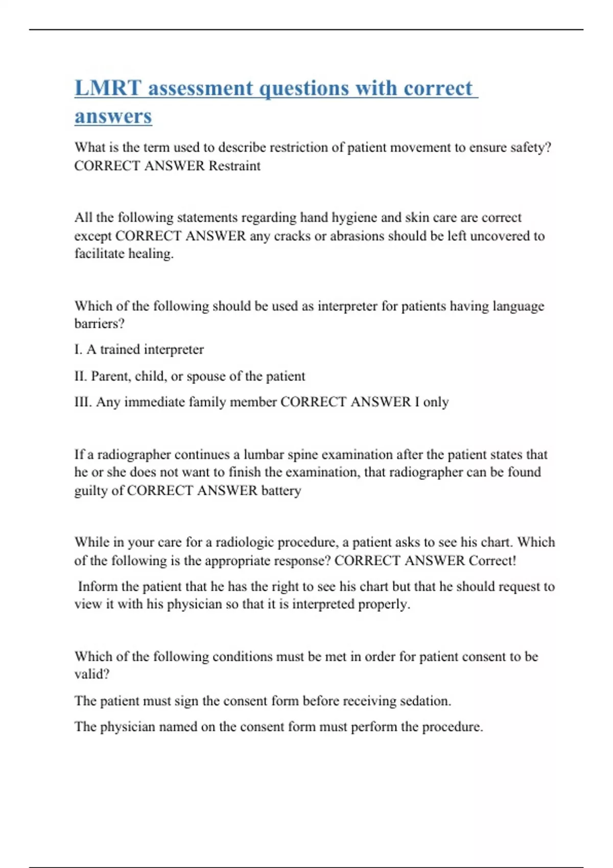 What is the term used to describe restriction of patient movement to ensure safety? CORRECT ANSWER Restraint All the following statements regarding hand hygiene and skin care are correct except CORRECT ANSWER any cracks or abrasions should be left uncovered to facilitate healing. Which of the following should be used as interpreter for patients having language barriers? I. A trained interpreter II. Parent, child, or spouse of the patient III. Any immediate family member CORRECT ANSWER I only If a radiographer continues a lumbar spine examination after the patient states that he or she does not want to finish the examination, that radiographer can be found guilty of CORRECT ANSWER battery While in your care for a radiologic procedure, a patient asks to see his chart. Which of the following is the appropriate response? CORRECT ANSWER Correct! Inform the patient that he has the right to see his chart but that he should request to view it with his physician so that it is interpreted pr