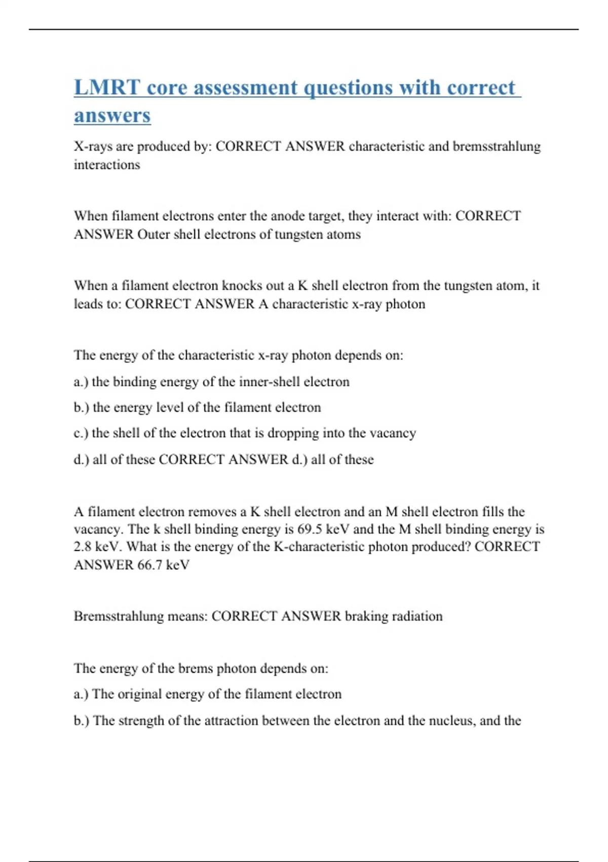X-rays are produced by: CORRECT ANSWER characteristic and bremsstrahlung interactions When filament electrons enter the anode target, they interact with: CORRECT ANSWER Outer shell electrons of tungsten atoms When a filament electron knocks out a K shell electron from the tungsten atom, it leads to: CORRECT ANSWER A characteristic x-ray photon The energy of the characteristic x-ray photon depends on: a.) the binding energy of the inner-shell electron b.) the energy level of the filament electron c.) the shell of the electron that is dropping into the vacancy d.) all of these CORRECT ANSWER d.) all of these A filament electron removes a K shell electron and an M shell electron fills the vacancy. The k shell binding energy is 69.5 keV and the M shell binding energy is 2.8 keV. What is the energy of the K-characteristic photon produced? CORRECT ANSWER 66.7 keV Bremsstrahlung means: CORRECT ANSWER braking radiation The energy of the brems photon depends on: a.) The original energy of the filament electron b.) The strength of the attraction betwe