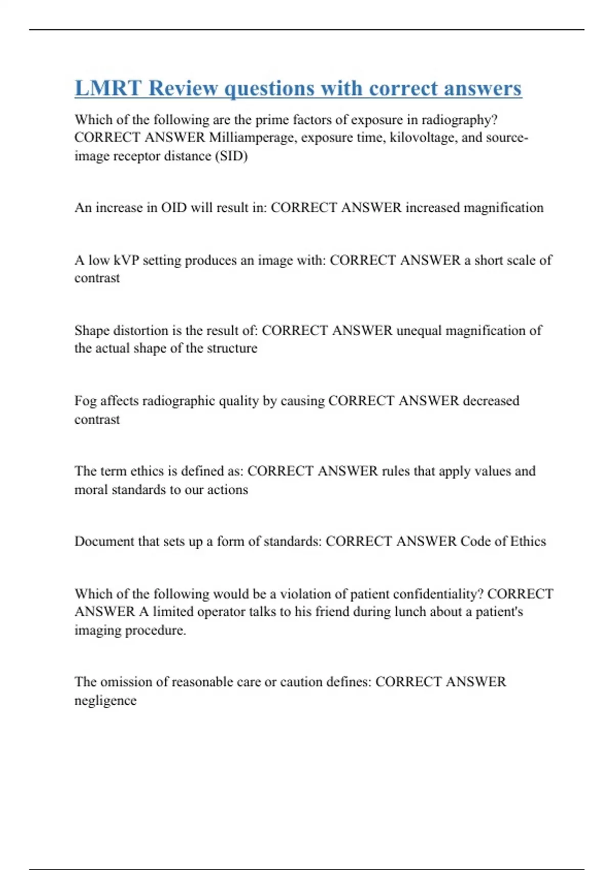 Which of the following are the prime factors of exposure in radiography? CORRECT ANSWER Milliamperage, exposure time, kilovoltage, and source-image receptor distance (SID) An increase in OID will result in: CORRECT ANSWER increased magnification A low kVP setting produces an image with: CORRECT ANSWER a short scale of contrast Shape distortion is the result of: CORRECT ANSWER unequal magnification of the actual shape of the structure Fog affects radiographic quality by causing CORRECT ANSWER decreased contrast The term ethics is defined as: CORRECT ANSWER rules that apply values and moral standards to our actions Document that sets up a form of standards: CORRECT ANSWER Code of Ethics Which of the following would be a violation of patient confidentiality? CORRECT ANSWER A limited operator talks to his friend