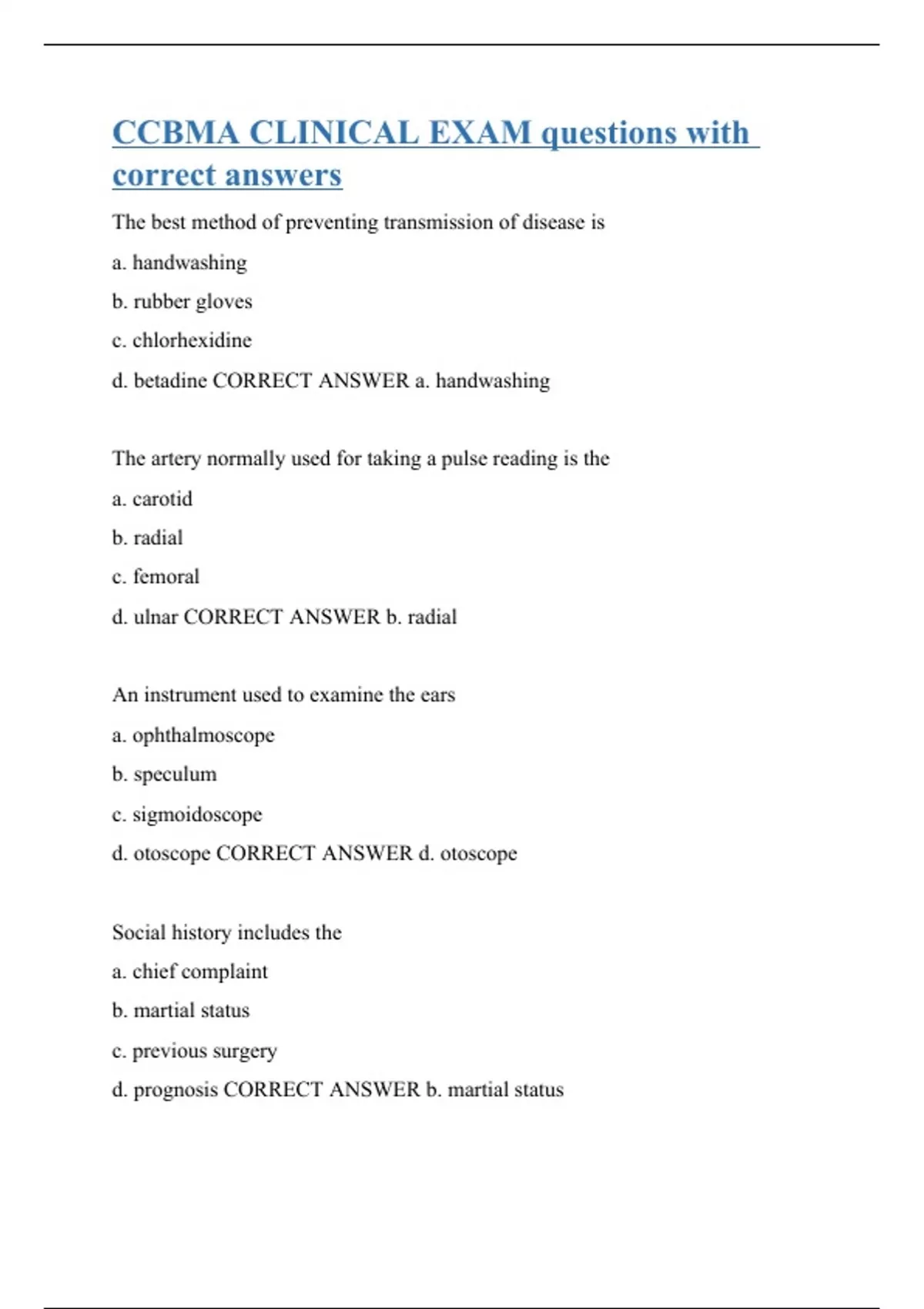 The best method of preventing transmission of disease is a. handwashing b. rubber gloves c. chlorhexidine d. betadine CORRECT ANSWER a. handwashing The artery normally used for taking a pulse reading is the a. carotid b. radial c. femoral d. ulnar CORRECT ANSWER b. radial An instrument used to examine the ears a. ophthalmoscope b. speculum c. sigmoidoscope d. otoscope CORRECT ANSWER d. otoscope Social history includes the a. chief complaint b. martial status c. previous surgery d. prognosis CORRECT ANSWER b. m