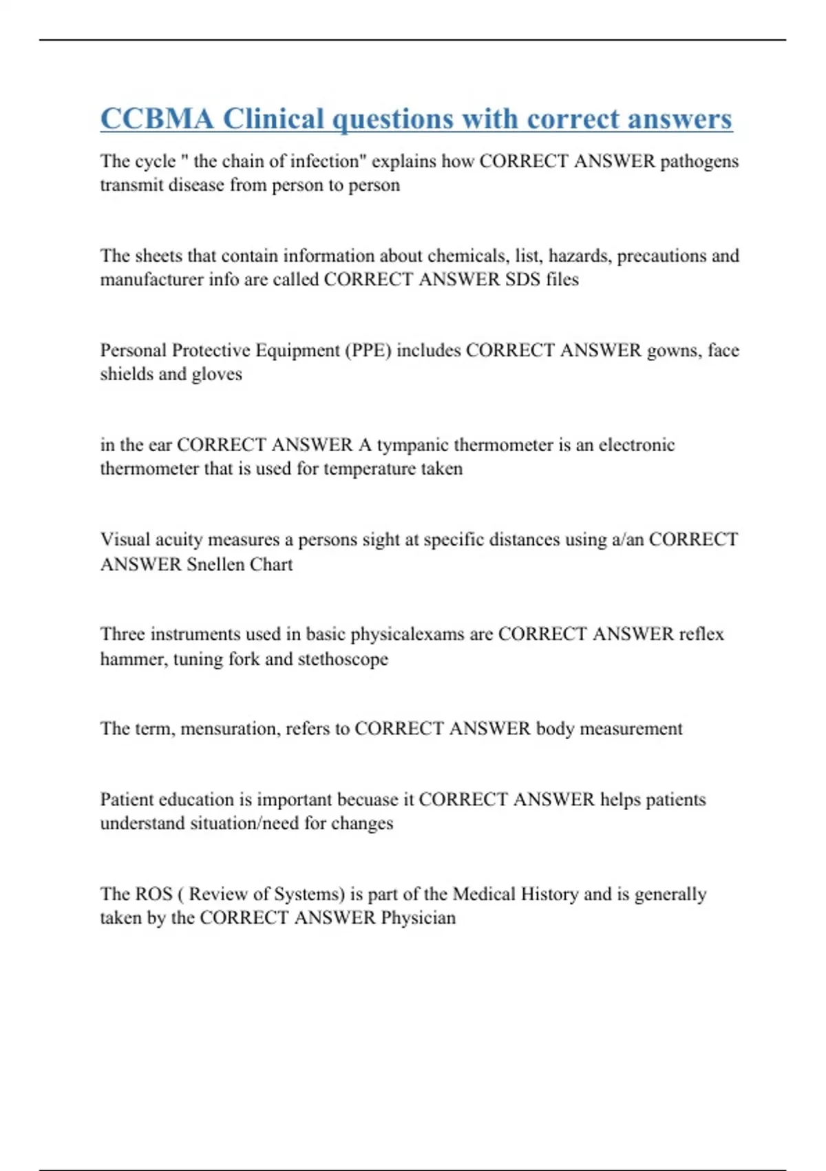 The cycle " the chain of infection" explains how CORRECT ANSWER pathogens transmit disease from person to person The sheets that contain information about chemicals, list, hazards, precautions and manufacturer info are called CORRECT ANSWER SDS files Personal Protective Equipment (PPE) includes CORRECT ANSWER gowns, face shields and gloves in the ear CORRECT ANSWER A tympanic thermometer is an electronic thermometer that is used for temperature taken Visual acuity measures a persons sight at specific distances using a/an CORRECT ANSWER Snellen Chart Three instruments used in basic physicalexams are CORRECT ANSWER reflex hammer, tuning fork and stethoscope The term, mensuration, refers to CORRECT ANSWER body measurement Patient education is important becuase it CORRECT ANSWER helps patients understand situation/need for c