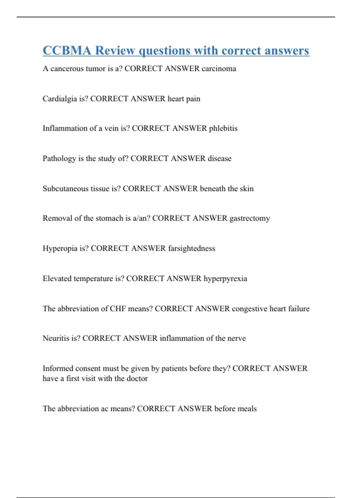 A cancerous tumor is a? CORRECT ANSWER carcinoma Cardialgia is? CORRECT ANSWER heart pain Inflammation of a vein is? CORRECT ANSWER phlebitis Pathology is the study of? CORRECT ANSWER disease Subcutaneous tissue is? CORRECT ANSWER beneath the skin Removal of the stomach is a/an? CORRECT ANSWER gastrectomy Hyperopia is? CORRECT ANSWER farsightedness Elevated temperature is? CORRECT ANSWER hyperpyrexia