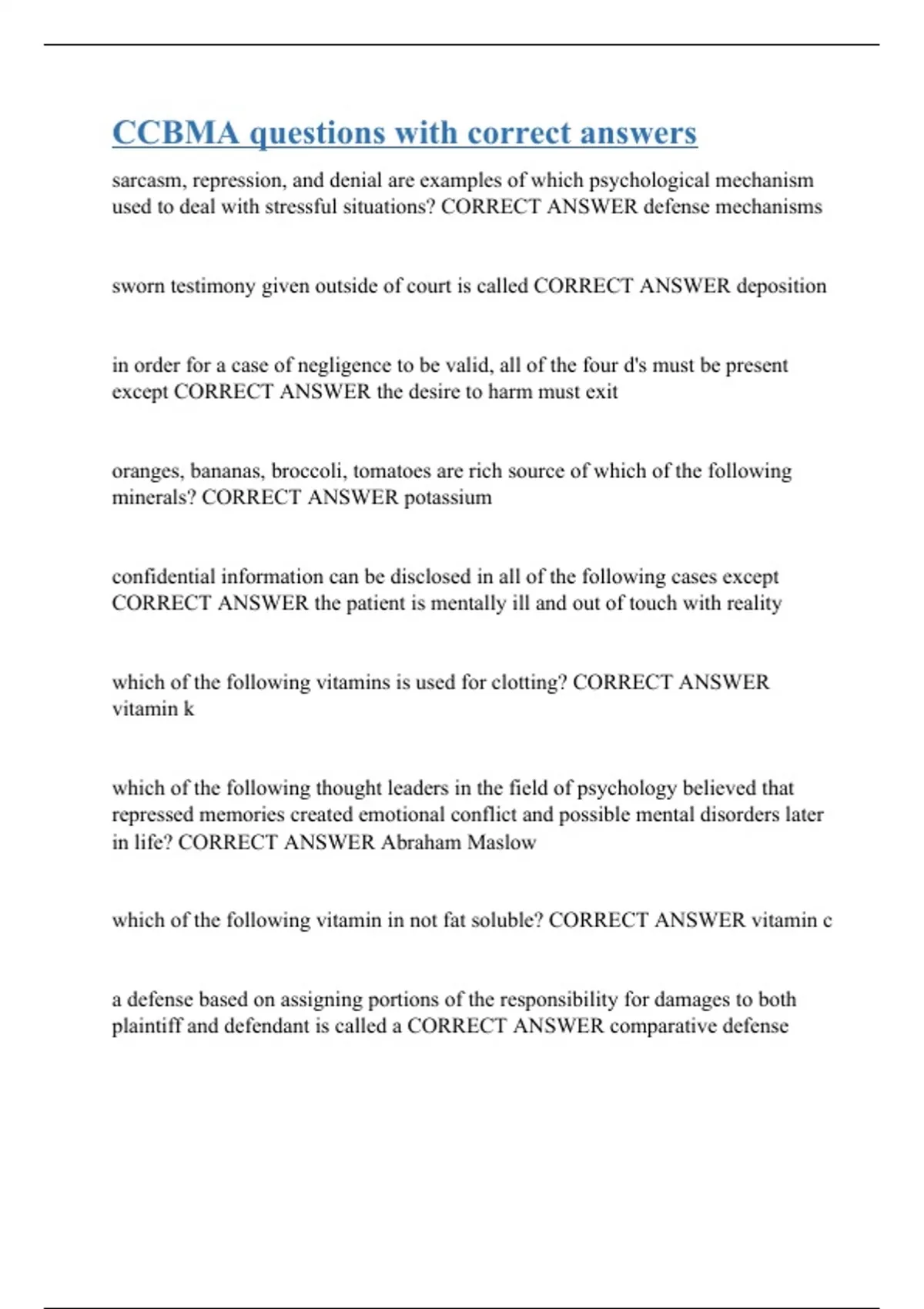 sarcasm, repression, and denial are examples of which psychological mechanism used to deal with stressful situations? CORRECT ANSWER defense mechanisms sworn testimony given outside of court is called CORRECT ANSWER deposition in order for a case of negligence to be valid, all of the four d's must be present except CORRECT ANSWER the desire to harm must exit oranges, bananas, broccoli, tomatoes are rich source of which of the following minerals? CORRECT ANSWER potassium confidential information can be disclosed in all of the following cases except CORRECT ANSWER the patient is mentally ill and out of touch with reality which of the following vitamins is used for clotting? CORRECT ANSWER vitamin k which of the following thought leaders in the field of psychology believed that repressed memories created emotional conflict and possible mental disorders later in life? CORRECT ANSWER Abraham Maslow which of the following vitamin in not fat