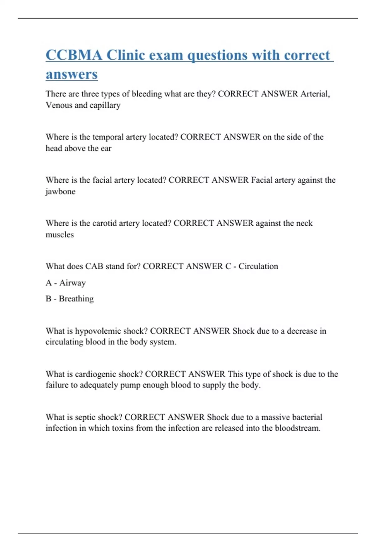 There are three types of bleeding what are they? CORRECT ANSWER Arterial, Venous and capillary Where is the temporal artery located? CORRECT ANSWER on the side of the head above the ear Where is the facial artery located? CORRECT ANSWER Facial artery against the jawbone Where is the carotid artery located? CORRECT ANSWER against the neck muscles What does CAB stand for? CORRECT ANSWER C - Circulation A - Airway B - Breathing What is hypovolemic shock? CORRECT ANSWER Shock due to a decrease in circulating blood in the body system. What is cardiogenic shock? CORRECT A