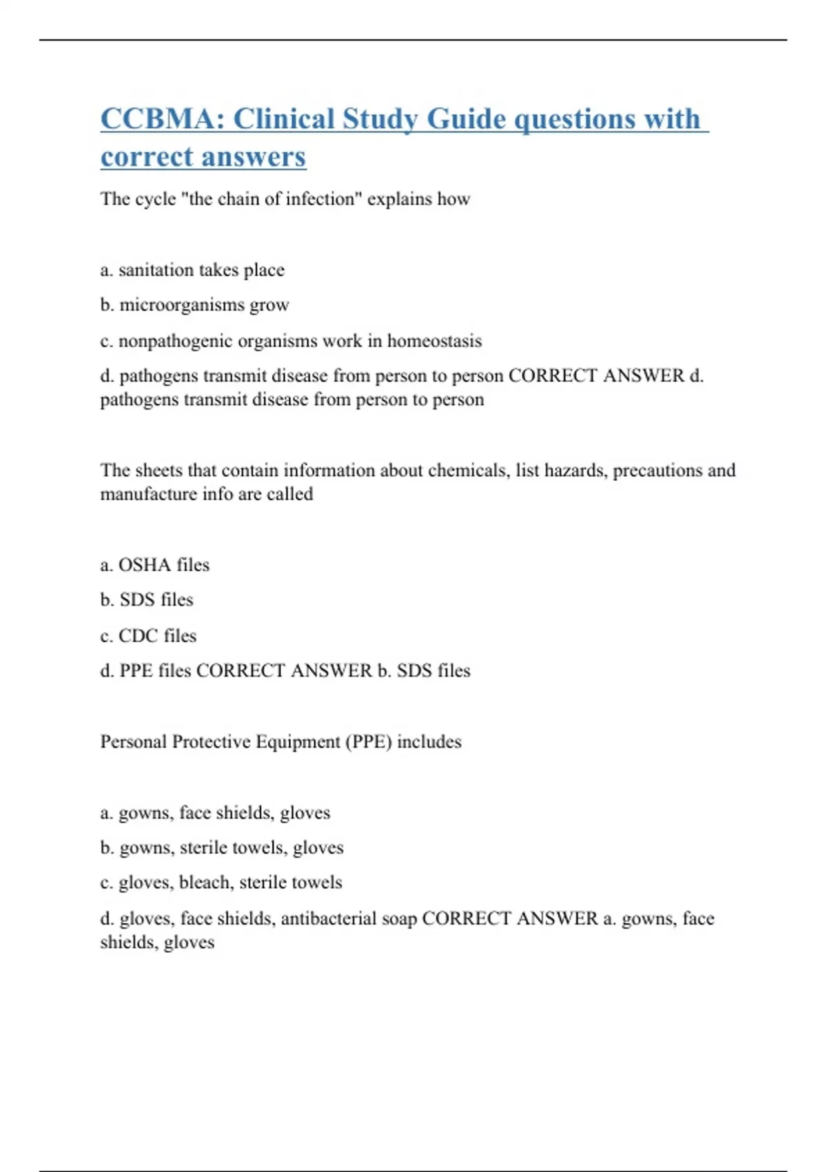 The cycle "the chain of infection" explains how a. sanitation takes place b. microorganisms grow c. nonpathogenic organisms work in homeostasis d. pathogens transmit disease from person to person CORRECT ANSWER d. pathogens transmit disease from person to person The sheets that contain information about chemicals, list hazards, precautions and manufacture info are called a. OSHA files b. SDS files c. CDC files d. PPE files CORRECT ANSWER b. SDS files Personal Protective Equipment (PPE) includes a. gowns, face shields, gloves b. gowns, sterile towels, gloves c. gloves, bleach, sterile towels d. gloves, face shields, antibacterial soap CORRECT ANSWER a. gowns, face shields, gloves