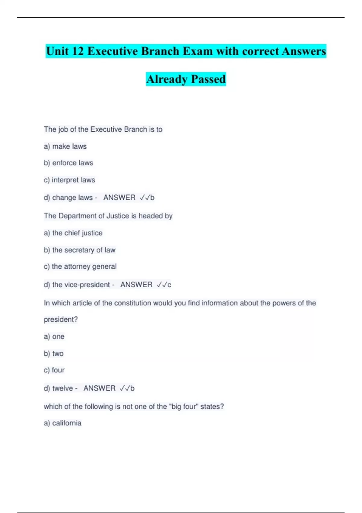 Unit 12 Executive Branch Exam with correct Answers Already Passed The job of the Executive Branch is to a) make laws b) enforce laws c) interpret laws d) change laws - ANSWER b The Department of Justice is headed by a) the chief justice b) the secretary of law c) the attorney general d) the vice-president - ANSWER c In which article of the constitution would you find information about the powers of the president? a) one b) two c) four d) twelve - ANSWER b which of the following is not one of the "big four" states? a) california