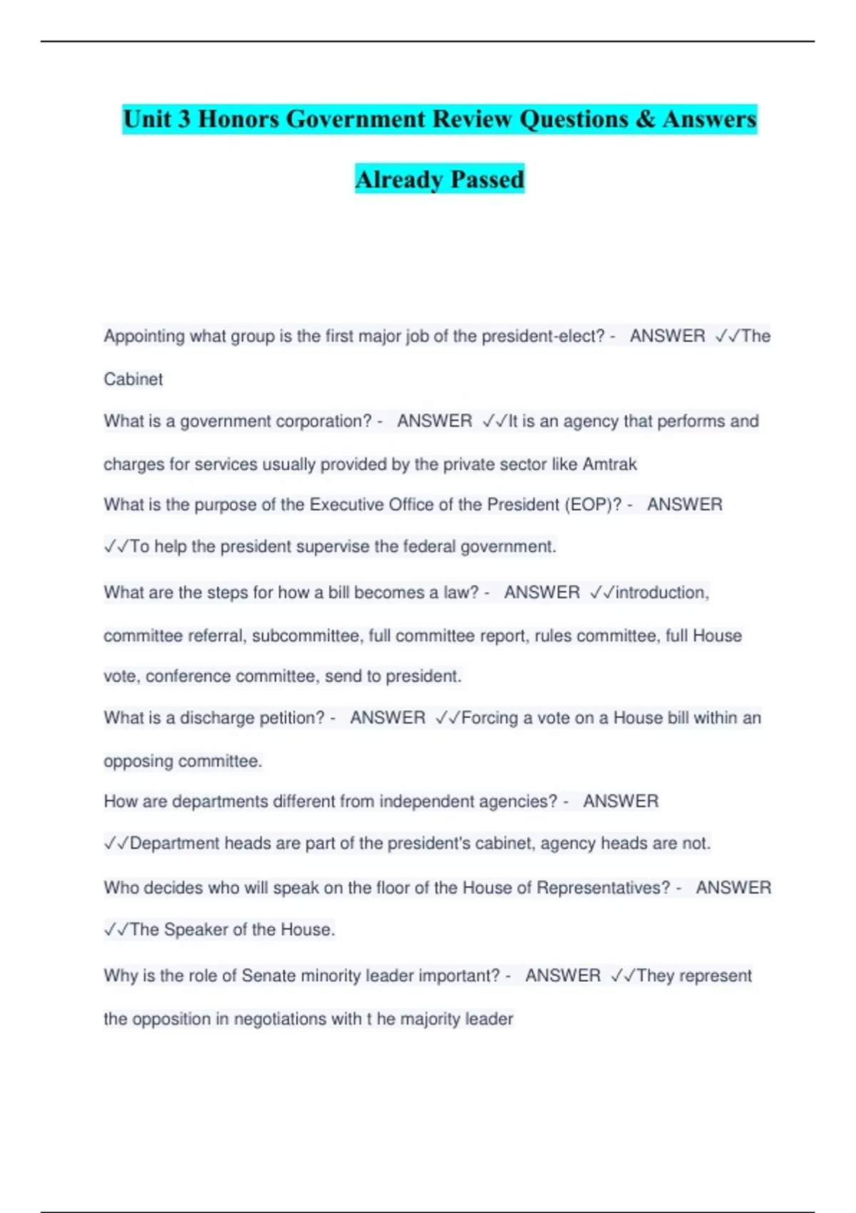 Unit 3 Honors Government Review Questions & Answers Already Passed Appointing what group is the first major job of the president-elect? - ANSWER The Cabinet What is a government corporation? - ANSWER It is an agency that performs and charges for services usually provided by the private sector like Amtrak What is the purpose of the Executive Office of the President (EOP)? - ANSWER To help the president supervise the federal government. What are the steps for how a bill becomes a law? - ANSWER introduction, committee referral, subcommittee, full committee report, rules committee, full House vote, conference committee, send to president. What is a discharge petition? - ANSWER Forcing a vote on a House bill within an opposing committee. How are departments different from independent agencies? - ANSWER Department heads are part of the president's cabinet, agency heads are not. Who decides who will speak on the floor of the House of Representatives? - ANSWER The Speaker of the House. Why is the role of Senate minority leader important? - ANSWER They represent the opposition in negotiations with t he majority leader