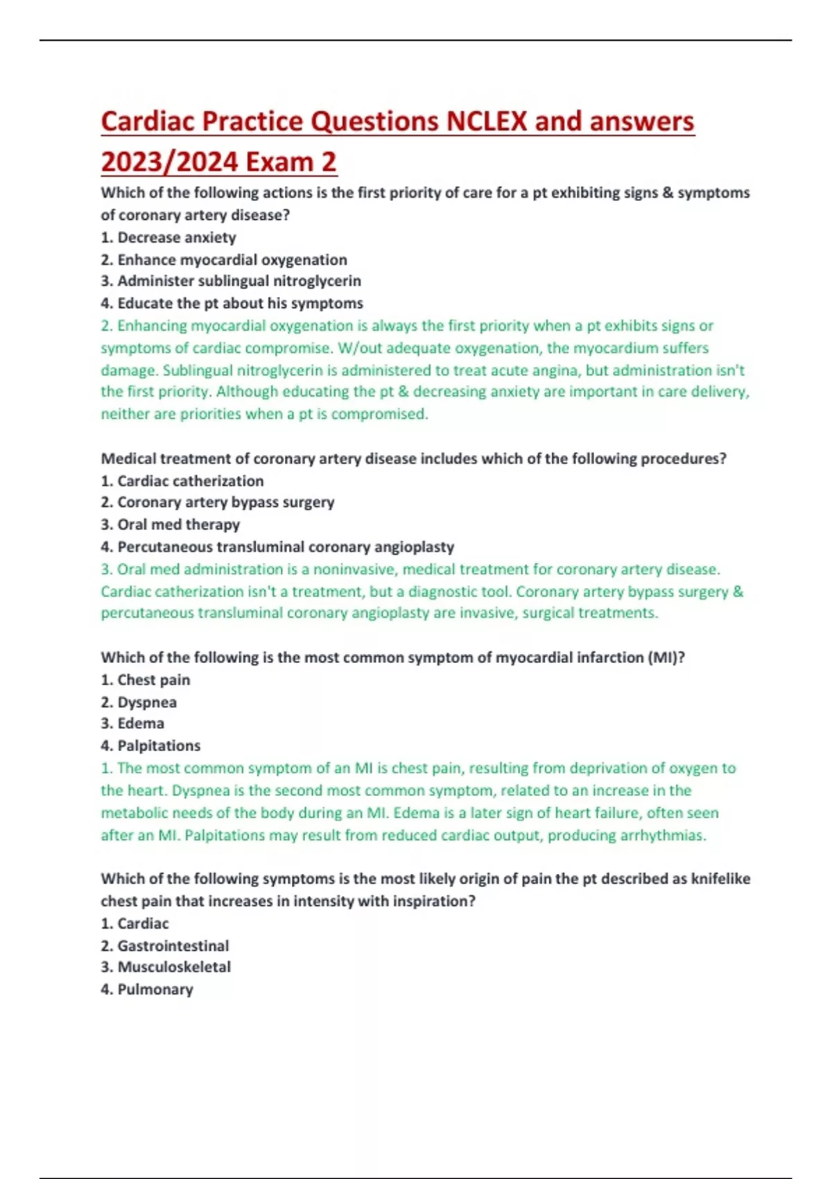 Cardiac Practice Questions NCLEX and answers 2023/2024 Exam 2