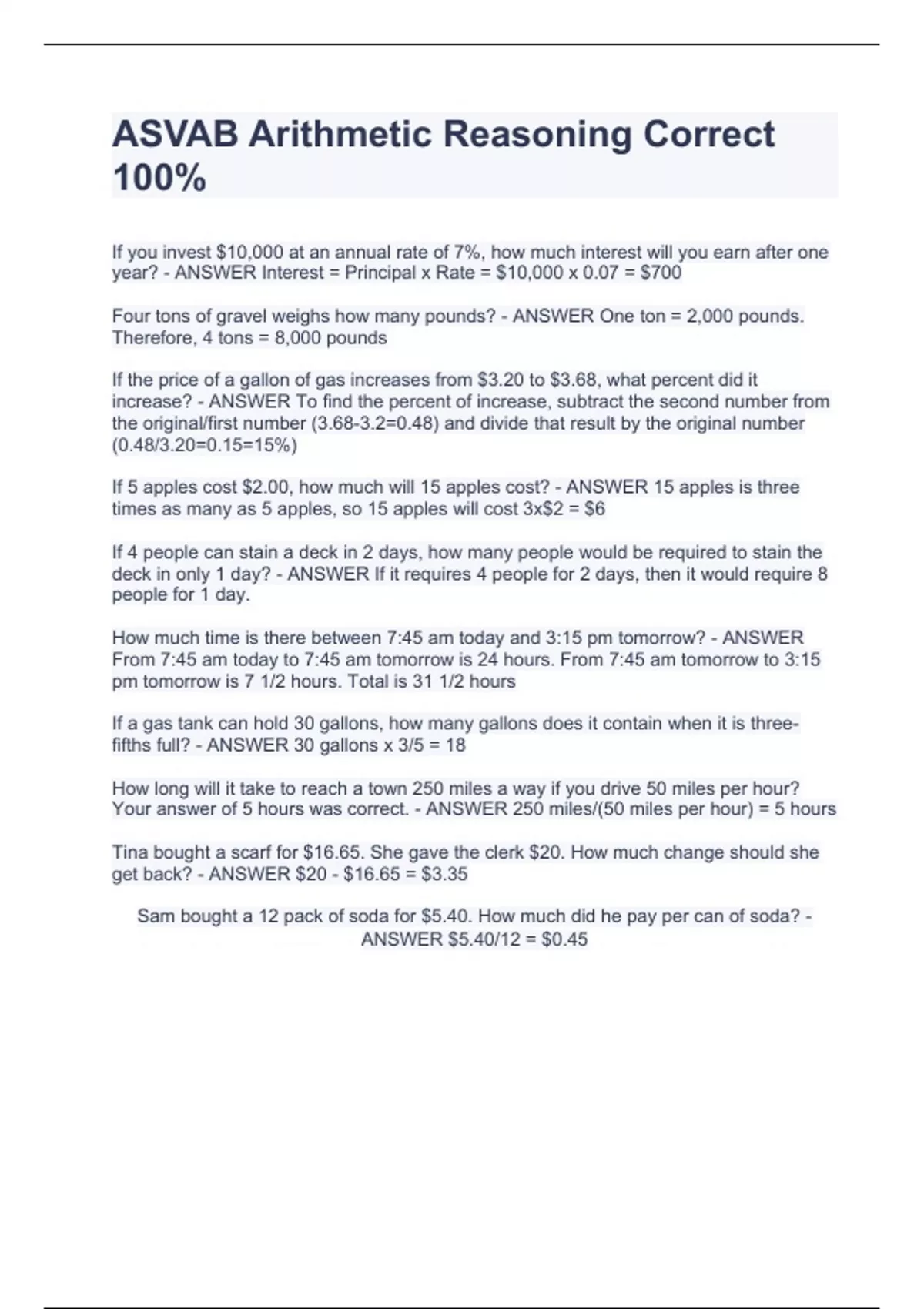 If you invest $10,000 at an annual rate of 7%, how much interest will you earn after one year? - ANSWER Interest = Principal x Rate = $10,000 x 0.07 = $700 Four tons of gravel weighs how many pounds? - ANSWER One ton = 2,000 pounds. Therefore, 4 tons = 8,000 pounds If the price of a gallon of gas increases from $3.20 to $3.68, what percent did it increase? - ANSWER To find the percent of increase, subtract the second number from the original/first number (3.68-3.2=0.48) and divide that result by the original number (0.48/3.20=0.15=15%) If 5 apples cost $2.00, how much will 15 apples cost? - ANSWER 15 apples is three times as many as 5 apples, so 15 apples will cost 3x$2 = $6 If 4 people can stain a deck in 2 days, how many people would be required to stain the deck in only 1 day? - ANSWER If it requires 4 people for 2 days, then it would require 8 people for 1 day. How much time is there between 7:45 am today and 3:15 pm tomorrow? - ANSWER From 7:45 am today to 7:45 am tomorrow is 24 hours. From 7:45 am tomorrow to 3:15 pm tomorrow is 7 1/2 hours. Total is 31 1/2 hours If a gas tank can hold 30 gallons, how