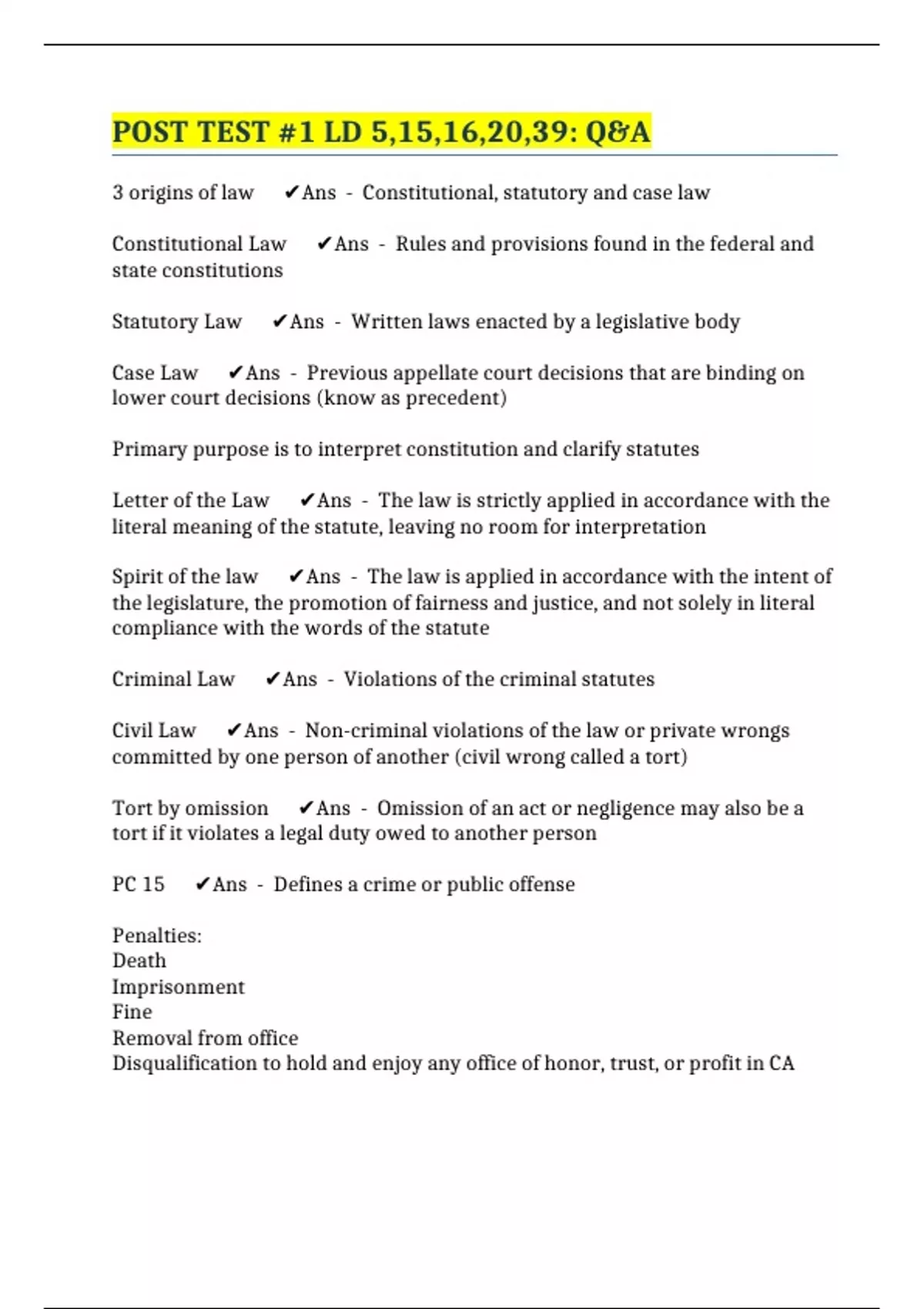 POST TEST #1 LD 5,15,16,20,39: Q&A