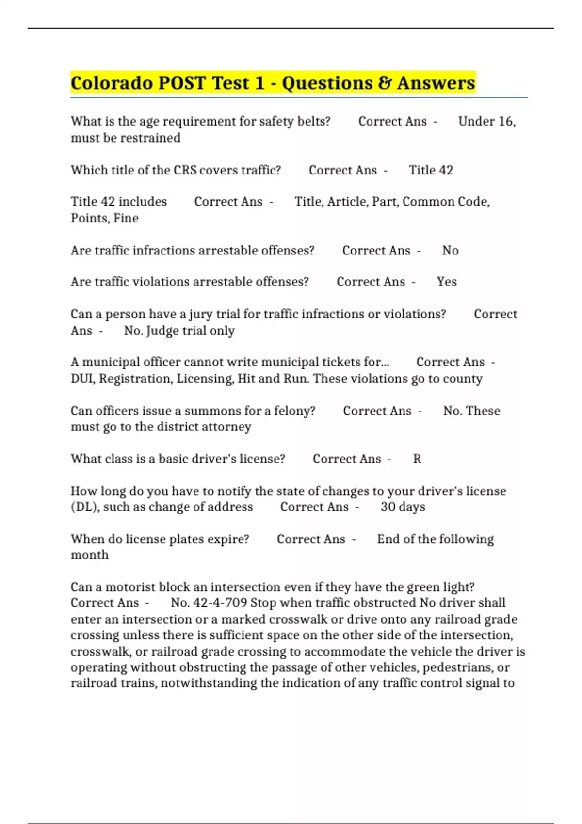 Colorado POST Test 1 - Questions & Answers