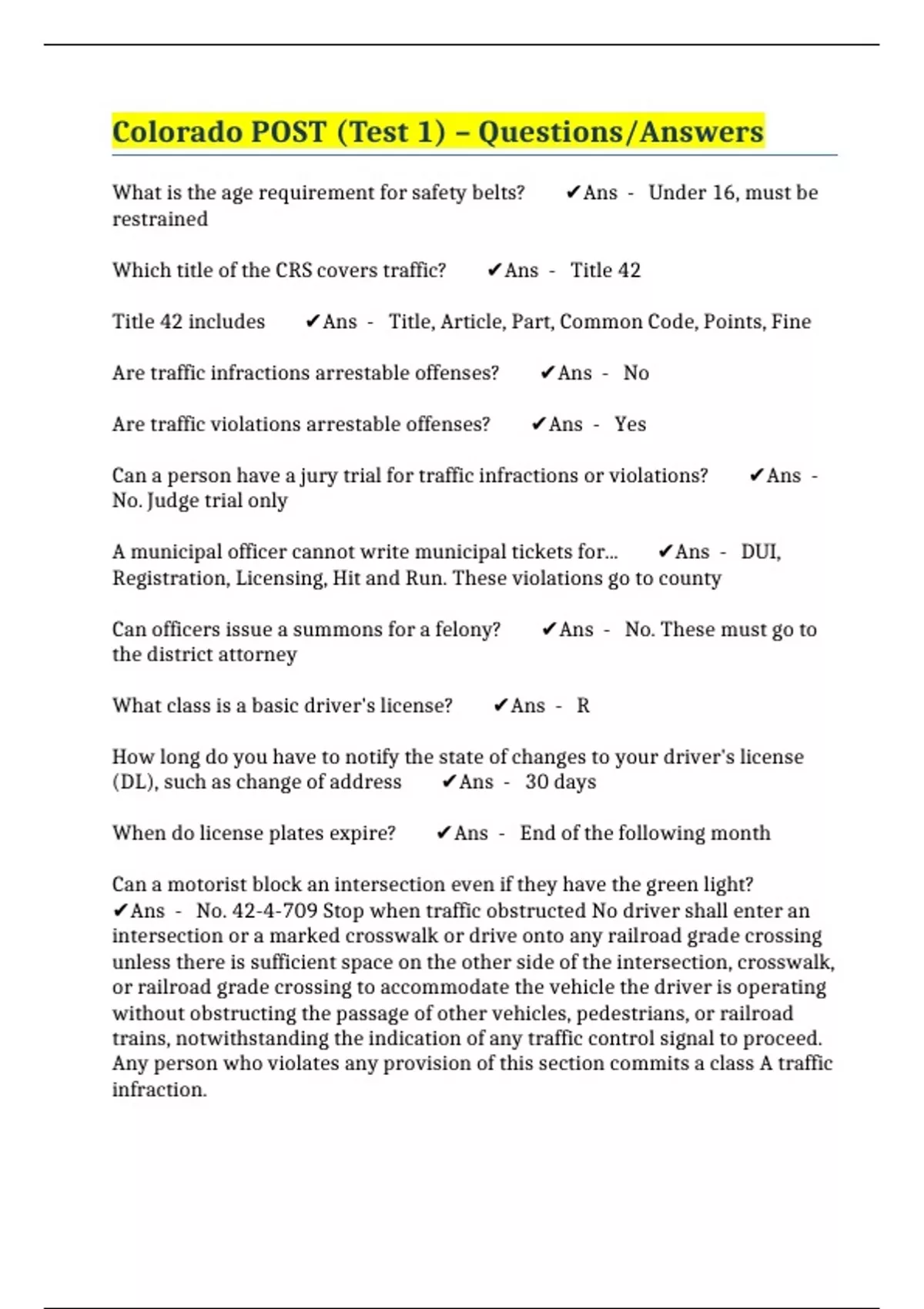 Colorado POST (Test 1) – Questions/Answers