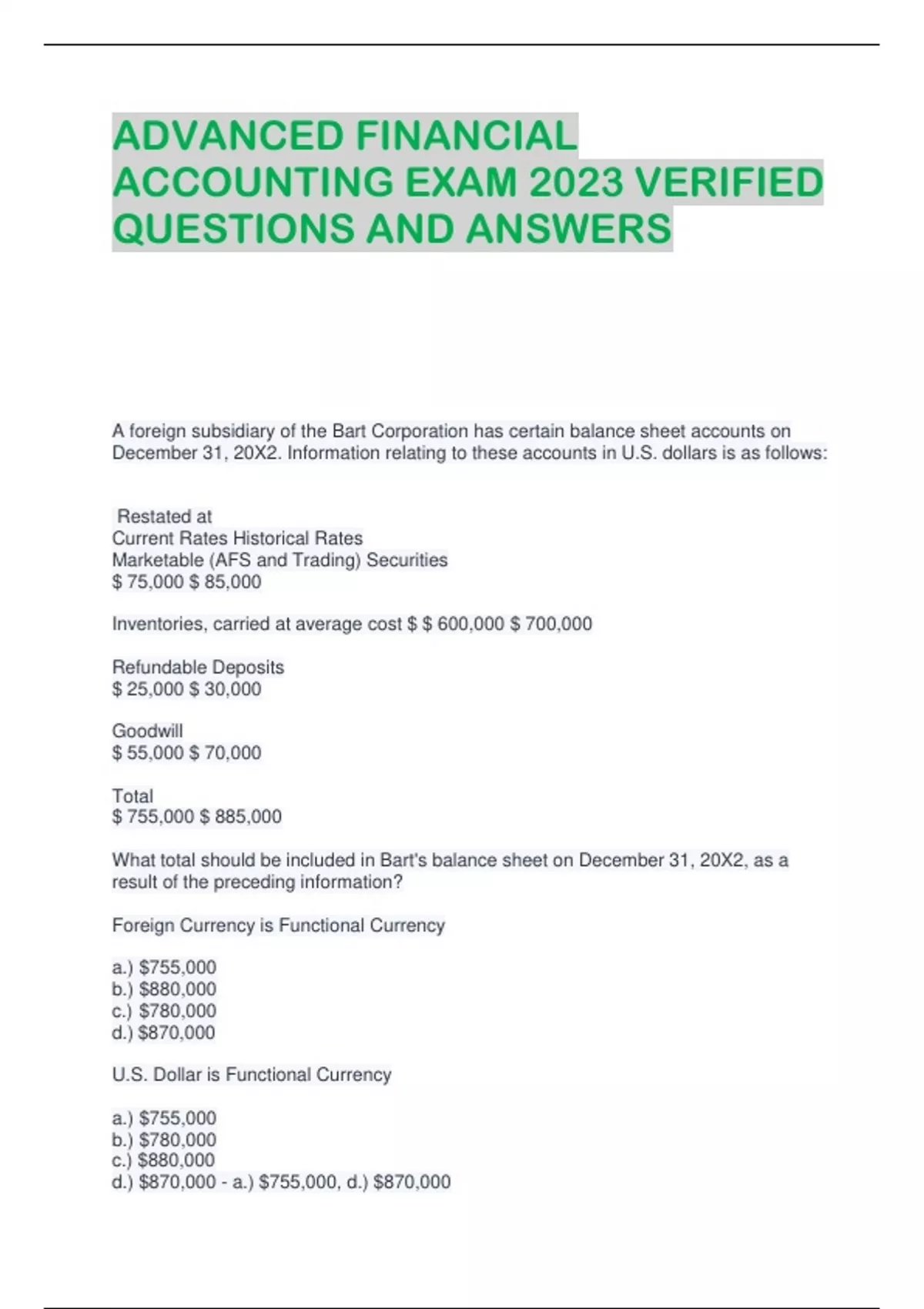 ADVANCED FINANCIAL ACCOUNTING EXAM 2023 VERIFIED QUESTIONS AND ANSWERS A foreign subsidiary of the Bart Corporation has certain balance sheet accounts on December 31, 20X2. Information relating to these accounts in U.S. dollars is as follows: Restated at Current Rates Historical Rates Marketable (AFS and Trading) Securities $ 75,000 $ 85,000 Inventories, carried at average cost $ $ 600,000 $ 700,000 Refundable Deposits $ 25,000 $ 30,000 Goodwill $ 55,000 $ 70,000 Total $ 755,000 $ 885,000 What total should be included in Bart's balance sheet on December 31, 20X2, as a result of the preceding information? Foreign Currency is Functional Currency a.) $755,000 b.) $880,000 c.) $780,000 d.) $870,000 U.S. Dollar is Functional Currency a.) $755,000 b.) $780,000 c.) $880,000 d.) $870,000 - a.) $755,000, d.) $870,000 A foreign subsidiary's functional currency is its local currency, which has not experienced significant inflation. The weighted-average exchange rate for the current year would be the appropriate exchange rate for translating Sales to Customers Wages Expense a.) No. No. b.) Yes. Yes. c.) No. Yes. d.) Yes. No. - b.) Yes, Yes. A wholly owned foreign subsidiary of Nick Inc. has certain expense accounts for the year ended December 31, 20X4, stated in local currency units (LCU) as follows: LCU Depreciation of Equipment (related assets were purchased January 1, 20X2) 120,000 Provision for Uncollectible Accounts 80,000 Rent 200,000 The exchange rates at various dates were as follows: Dollar Equivalent of 1 LCU January 1, 20X2 0.50 December 31, 20X4 0.40 Average, 20X4 0.44 What total dollar amount should be included in Nick's income statement to reflect the preceding expenses for the year ended December 31, 20X4? Foreign Currency is Functional Currency U.S. Dollar is Functional Currency a.) $183,200 b.) $176,000 c.) $168,000 d.) $160,000 a.) $168,000 b.) $160,000 c.) $176,000 d.) $183,200 - b.) $176,000, d.) $183,200 An entity denominated a December 15, 20X6, purchase of goods in a currency other than its functional currency. The transaction resulted in a payable fixed in terms of the amount of foreign currency and was paid on the settlement date, January 20, 20X7. The exchange rates between the functional currency and the currency in which the transaction was denominated changed at December 31, 20X6, resulting in a loss that should a.) Not be reported until January 20, 20X7, the settlement date. b.) Be included as a separate component of stockholders' equity at December 31, 20X6. c.) Be included as a deferred charge at December 31, 20X6. d.) Be included as a component of income from continuing operations for 20X6. - d.) Be included as a component of income from continuing operations for 20X6. An entity denominated a sale of goods in a currency other than its functional currency. The sale resulted in a receivable fixed in terms of the amount of foreign currency to be received. The exchange rate between the functional currency and the currency in which the transaction was denominated changed. The effect of the change should be included as a a.) Separate component of stockholders' equity whether the change results in a gain or a loss. b.) Separate component of stockholders' equity if the change results in a gain and as a component of income if the change results in a loss. c.) Component of income if the change results in a gain and as a separate component of stockholders' equity if the change results in a loss. d.) Component of income whether the change results in a gain or a loss. - d.) Component of income whether the change results in a gain or a loss. Bar Corporation had a realized foreign exchange loss of $13,000 for the year ended December 31, 20X2, and must also determine whether the following items will require year-end adjustment: Bar had a $7,000 credit resulting from the restatement in dollars of the accounts of its wholly owned foreign subsidiary for the year ended December 31, 20X2. Bar had an account payable to an unrelated foreign supplier to be paid in the supplier's local currency. The U.S. dollar equivalent of the payable was $60,000 on the October 31, 20X2, invoice date and $64,000 on December 31, 20X2. The invoice is payable on January 30, 20X3. What amount of the net foreign exchange loss in computing net income should be reported in Bar's 20X2 consolidated income statement? LCU is Functional Currency a.) $17,000 b.) $ 6,000 c.) $13,000 d.) $10,000 U.S. Dollar is Functional Currency a.) $ 6,000 b.) $17,000 c.) $10,000 d.) $13,000 - a.) $17,000, c.) $10,000 Cash $ 20,000 Other Assets 180,000 $ 200,000 Liabilities $ 50,000 Alex, Capital (40%) 37,000 Betty, Capital (40%) 65,000 Claire, Capital (20%) 48,000 Total Liabilities and Capital $ 200,000 If A is the total capital of a partnership before the admission of a new partner, B is the total capital of the partnership after the new partner's investment, C is the amount of the new partner's investment, and D is the amount of capital credit to the new partner, then there is a.) Neither bonus nor goodwill if B = A - C and D > C. b.) Goodwill to the new partner if B > ( A + C ) and D < C. c.) A bonus to the new partner if B = A + C and D < C. d.) Goodwill to the old partners if B > ( A + C ) and D = C. - d.) Goodwill to the old partners if B > ( A + C ) and D = C. Cash $ 20,000 Other Assets 180,000 $ 200,000 Liabilities $ 50,000 Alex, Capital (40%) 37,000 Betty, Capital (40%) 65,000 Claire, Capital (20%) 48,000 Total Liabilities and Capital $ 200,000 At December 31, Rod and Sheri are partners with capital balances of $40,000 and $20,000, and they share profits and losses in the ratio of 2:1, respectively. On this date, Pete invests $17,000 in cash for a 20 percent interest in the new partnership's capital and profit. Assuming that the bonus method is used, how much should be credited to Pete's capital account on December 31? a.) $15,400 b.) $17,000 c.) $15,000 d.) $12,000 - a.) $15,400 Cash $ 20,000 Other Assets 180,000 $ 200,000 L