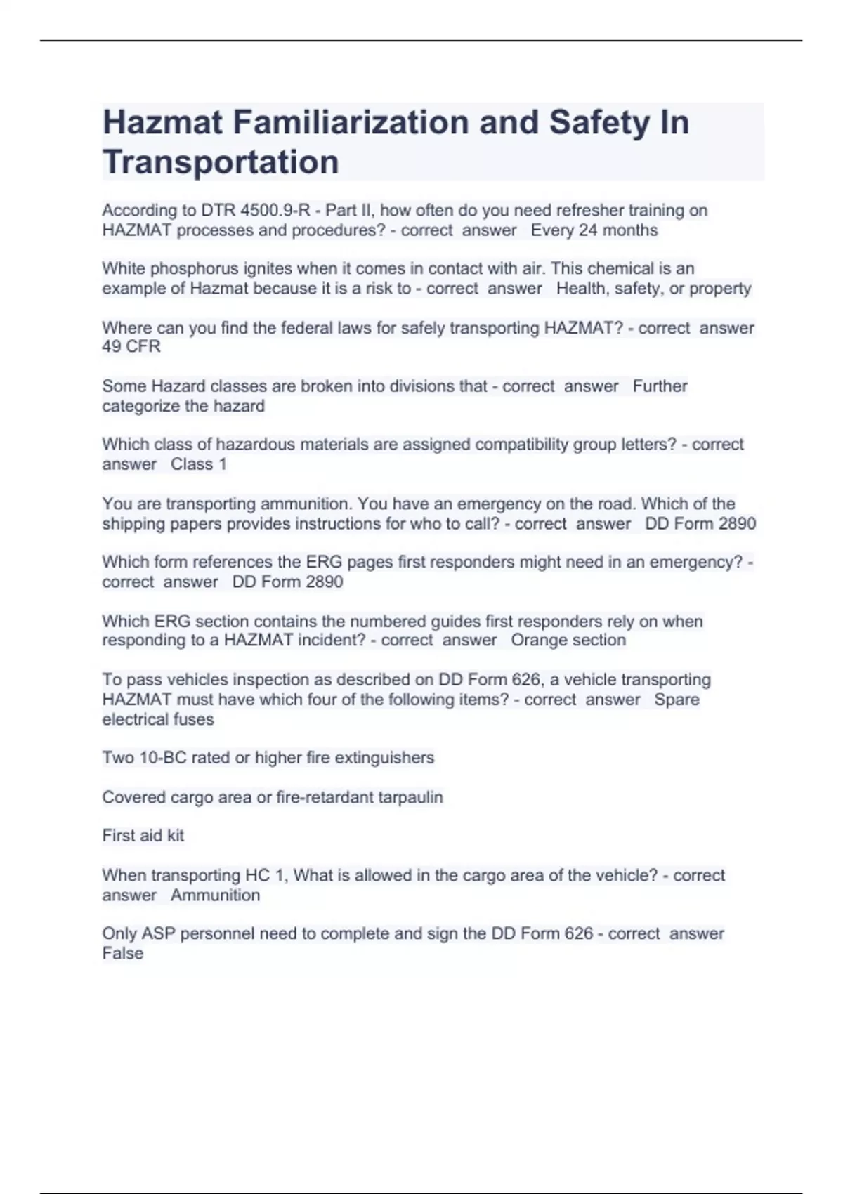 Hazmat Familiarization and Safety In Transportation Questions with complete solution 2023/2024According to DTR 4500.9-R - Part II, how often do you need refresher training on HAZMAT processes and procedures? - correct answer Every 24 months White phosphorus ignites when it comes in contact with air. This chemical is an example of Hazmat because it is a risk to - correct answer Health, safety, or property Where can you find the federal laws for safely transporting HAZMAT? - correct answer 49 CFR Some Hazard classes are broken into divisions that - correct answer Further categorize the hazard Which class of hazardous materials are assigned compatibility group letters? - correct answer Class 1 You are transporting ammunition. You have an emergency on the road. Which of the shipping papers provides