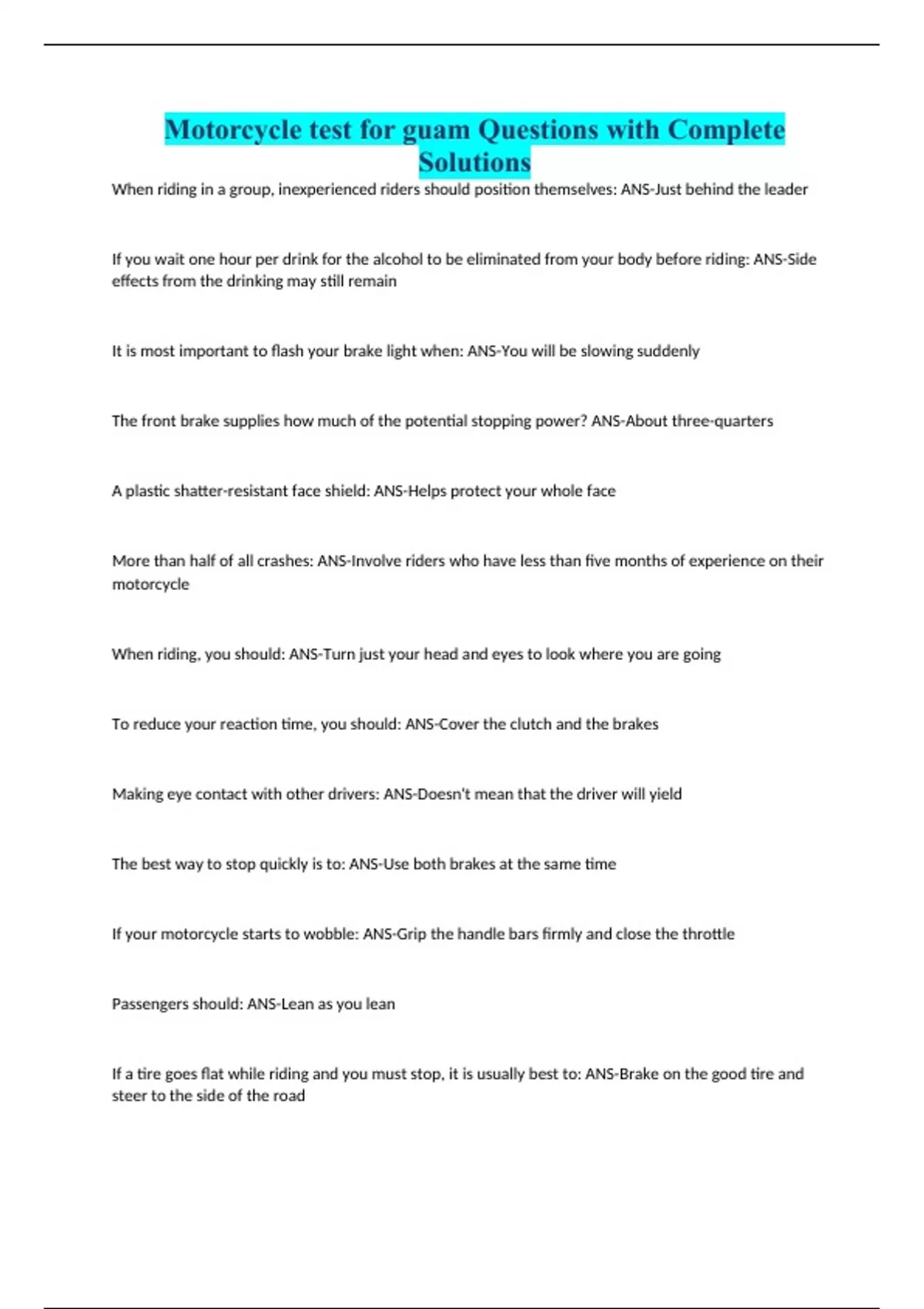 Motorcycle test for guam Questions with Complete Solutions When riding in a group, inexperienced riders should position themselves: ANS-Just behind the leader If you wait one hour per drink for the alcohol to be eliminated from your body before riding: ANS-Side effects from the drinking may still remain It is most important to flash your brake light when: ANS-You will be slowing suddenly The front brake supplies how much of the potential stopping power? ANS-About three-quarters A plastic shatter-resistant face shield: ANS-Helps protect your whole face More than half of all crashes: ANS-Involve riders who have less than five months of experience on their motorcycle When riding, you should: ANS-Turn just your head and eyes to look where you are going To reduce your reaction time, you should: ANS-Cover the clutch and the brakes Making eye contact with other drivers: ANS-Doesn't mean that the driver will yield The best way to stop quickly is to: ANS-Use both brakes at the same time If your motorcycle starts to wobble: ANS-Grip the handle bars firmly and close the throttle Passengers should: ANS-Lean as you lean If a tire goes flat while riding and you must stop, it is usually best to: ANS-Brake on the good tire and steer to the side of the road