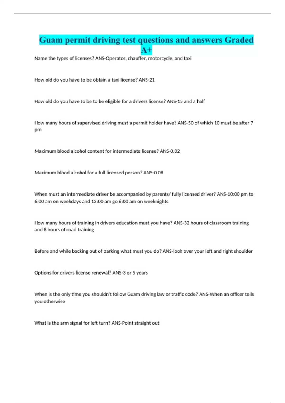 Guam permit driving test questions and answers Graded A+ Name the types of licenses? ANS-Operator, chauffer, motorcycle, and taxi How old do you have to be obtain a taxi license? ANS-21 How old do you have to be to be eligible for a drivers license? ANS-15 and a half How many hours of supervised driving must a permit holder have? ANS-50 of which 10 must be after 7 pm Maximum blood alcohol content for intermediate license? ANS-0.02 Maximum blood alcohol for a full licensed person? ANS-0.08 When must an intermediate driver be accompanied by parents/ fully licensed driver? ANS-10:00 pm to 6:00 am on weekdays and 12:00 am go 6:00 am on weeknights How many hours of training in drivers education must you have? ANS-32 hours of classroom training and 8 hours of road training Before and while backing out of parking what must you do? ANS-look over your left and right shoulder Options for drivers license renewal? ANS-3 or 5 years When is the only time you shouldn't follow Guam driving law or traffic code? ANS-When an officer tells you otherwise What is the arm signal for left turn? ANS-Point straight out