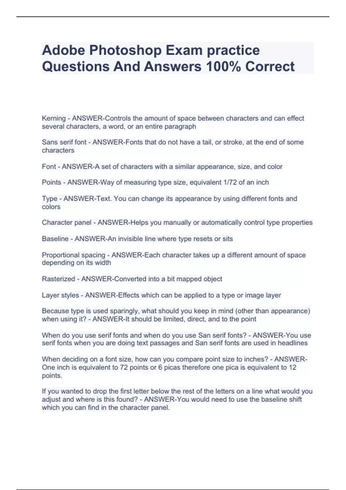Kerning - ANSWER-Controls the amount of space between characters and can effect several characters, a word, or an entire paragraph Sans serif font - ANSWER-Fonts that do not have a tail, or stroke, at the end of some characters Font - ANSWER-A set of characters with a similar appearance, size, and color Points - ANSWER-Way of measuring type size, equivalent 1/72 of an inch Type - ANSWER-Text. You can change its appearance by using different fonts and colors Character panel - ANSWER-Helps you manually or automatically control type properties Baseline - ANSWER-An invisible line where type resets or sits Proportional spacing - ANSWER-Each character takes up a different amount of space depending on its width Rasterized - ANSWER-Converted into a bit mapped object Layer styles - ANSWER-Effects which can be applied to a type or image layer Because type is used sparingly, what should you keep in mind (other than appearance) when using it? - ANSWER-It should be limited, direct, and to the point When do you use serif fonts and when do you use San serif fonts? - ANSWER-You use serif fonts when you are doing text passages and San serif fonts are used in headlines When deciding on a font size, how can you compare point size to inches? - ANSWER-One inch is equivalent to 72 points or 6 picas therefore one pica is equivalent to 12 points. If you wanted to drop the first letter below the rest of the letters on a line what would you adjust and where is this found? - ANSWER-You would need to use the baseline shift which you can find in the character panel.