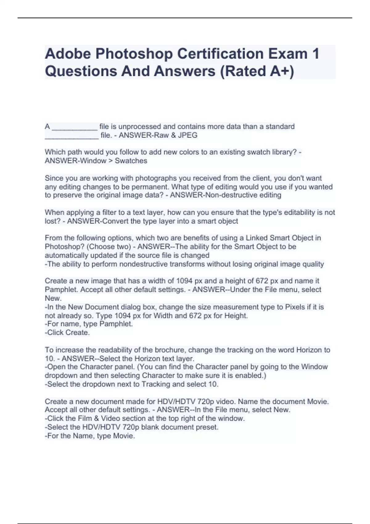 A ___________ file is unprocessed and contains more data than a standard _____________ file. - ANSWER-Raw & JPEG Which path would you follow to add new colors to an existing swatch library? - ANSWER-Window > Swatches Since you are working with photographs you received from the client, you don't want any editing changes to be permanent. What type of editing would you use if you wanted to preserve the original image data? - ANSWER-Non-destructive editing When applying a filter to a text layer, how can you ensure that the type's editability is not lost? - ANSWER-Convert the type layer into a smart object From the following options, which two are benefits of using a Linked Smart Object in Photoshop? (Choose two) - ANSWER--The ability for the Smart Object to be automatically updated if the source file is changed -The ability to perform nondestructive transforms without losing original image quality Create a new image that has a width of 1094 px and a height of 672 px and name it Pamphlet. Accept all other default settings. - ANSWER--Under the File menu, select New. -In the New Document dialog box, change the size measurement type to Pixels if it is not already so. Type 1094 px for Width and 672 px for Height. -For name, type Pamphlet. -Click Create. To increase the readability of the brochure, change the tracking on the word Horizon to 10. - ANSWER--Select the Horizon text layer. -Open the Character panel. (You can find the Character panel by going to the Window dropdown and then selecting Character to make sure it is enabled.) -Select the dropdown next to Tracking and select 10. Create a new document made for HDV/HDTV 720p video. Name the document Movie. Accept all other default settings. - ANSWER--In the File menu, select New. -Click the Film & Video section at the top right of the window. -Select the HDV/HDTV 720p blank document preset. -For the Name, type Movie. -Leave all other defaults. -Click Create.