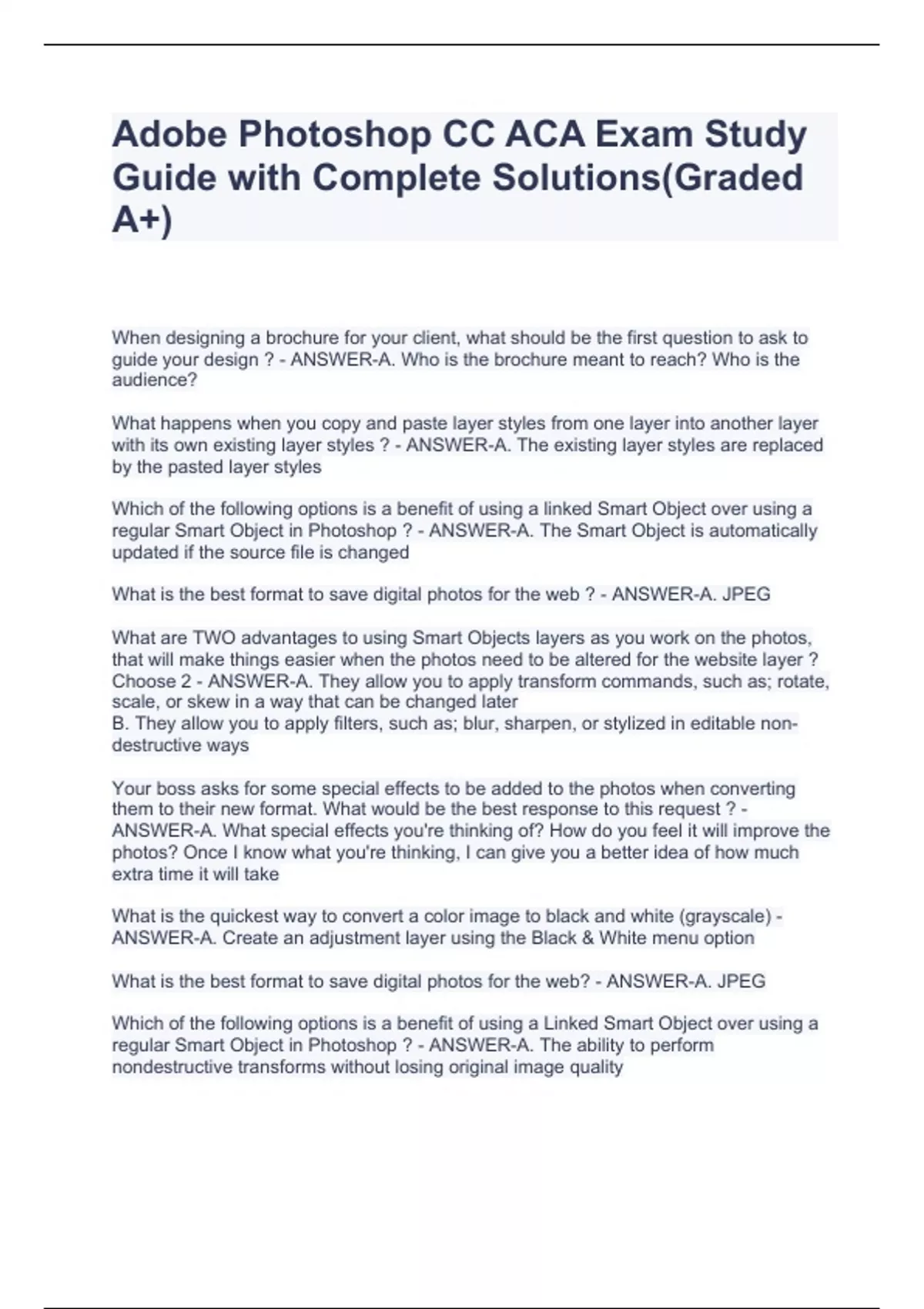 When designing a brochure for your client, what should be the first question to ask to guide your design ? - ANSWER-A. Who is the brochure meant to reach? Who is the audience? What happens when you copy and paste layer styles from one layer into another layer with its own existing layer styles ? - ANSWER-A. The existing layer styles are replaced by the pasted layer styles Which of the following options is a benefit of using a linked Smart Object over using a regular Smart Object in Photoshop ? - ANSWER-A. The Smart Object is automatically updated if the source file is changed What is the best format to save digital photos for the web ? - ANSWER-A. JPEG What are TWO advantages to using Smart Objects layers as you work on the photos, that will make things easier when the photos need to be altered for the website layer ? Choose 2 - ANSWER-A. They allow you to apply transform commands, such as; rotate, scale, or skew in a way that can be changed later B. They allow you to apply filters, such as; blur, sharpen, or stylized in editable non-destructive ways Your boss asks for some special effects to be added to the photos when converting them to their new format. What would be the best response to this request ? - ANSWER-A. What special effects you're thinking of? How do you feel it will improve the photos? Once I know what you're thinking, I can give you a better idea of how much extra time it will take What is the quickest way to convert a color image to black and white (grayscale) - ANSWER-A. Create an adjustment layer using the Black & White menu option What is the best format to save digital photos for the web? - ANSWER-A. JPEG Which of the following options is a benefit of using a Linked Smart Object over using a regular Smart Object in Photoshop ? - ANSWER-A. The ability to perform nondestructive transforms without losing original image quality